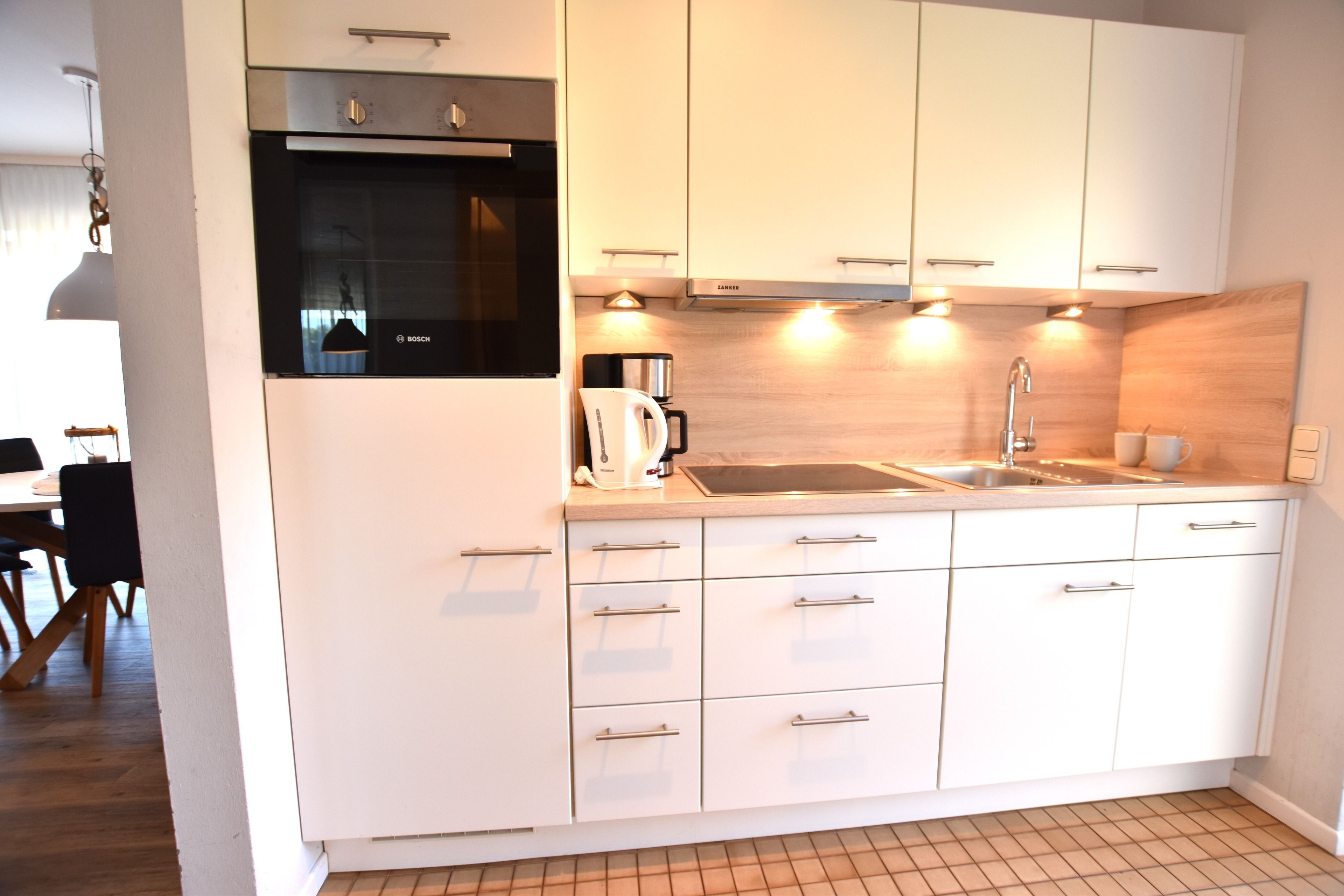 Eingangsflur mit offener Küche mit Wasserkocher, Geschirrspüler und vielem mehr. Schlafzimmer (1) mit zwei Einzelbetten ( 90 cm x 200 cm), Kleiderschrank und Rolladen.