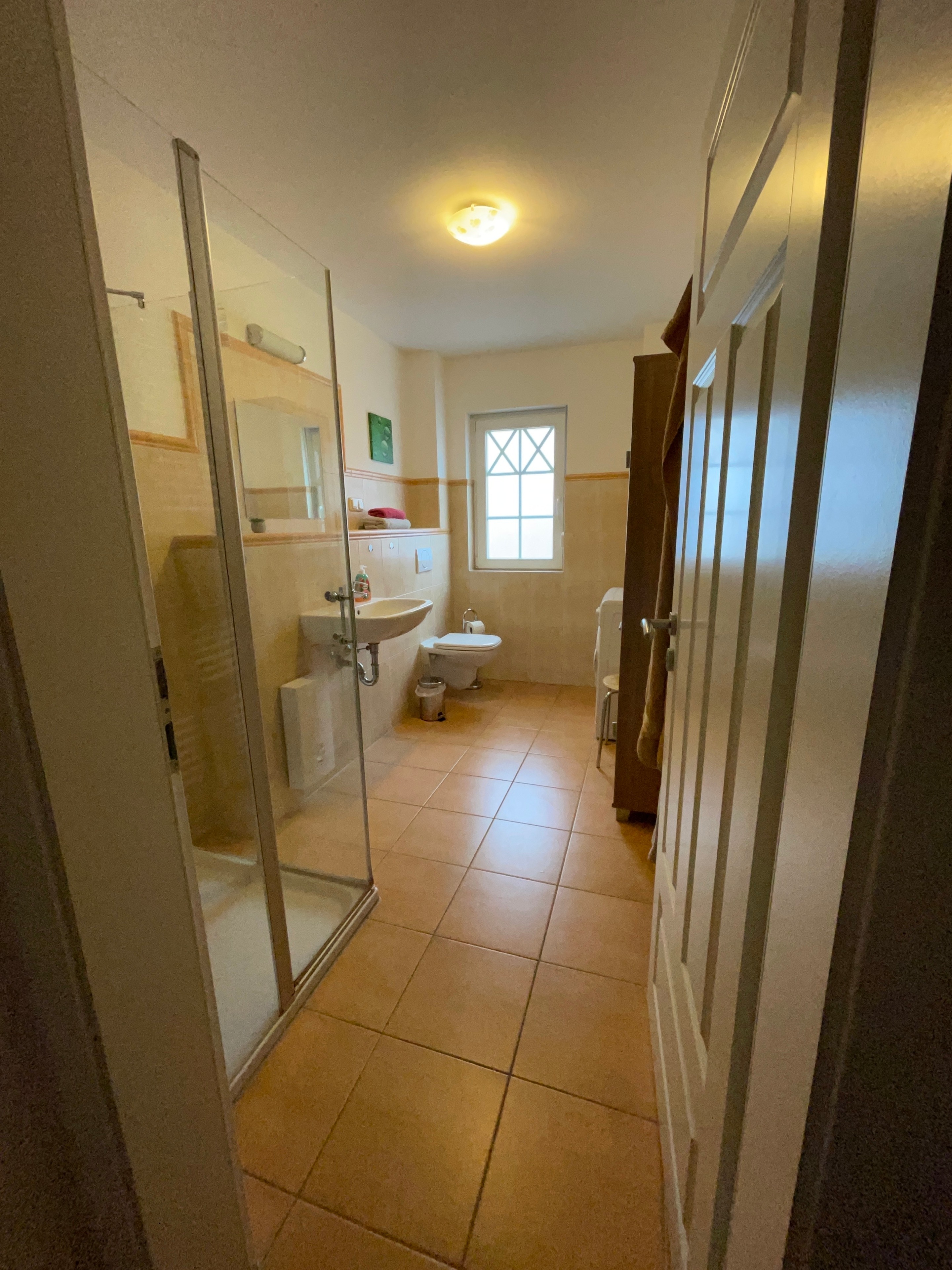 Bad mit ebenerdiger Dusche, WC und Waschmaschine.