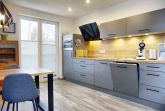 Die voll ausgestattete Küche mit Geschirrspüler, Kühlschrank mit Gefrierfach und einer im Backofen integrierten Mikrowelle lässt keine Wünsche offen.