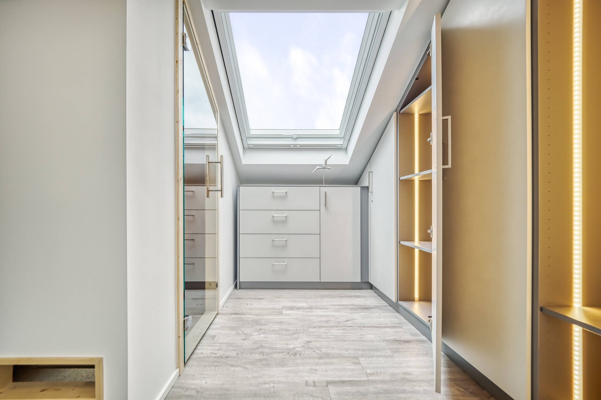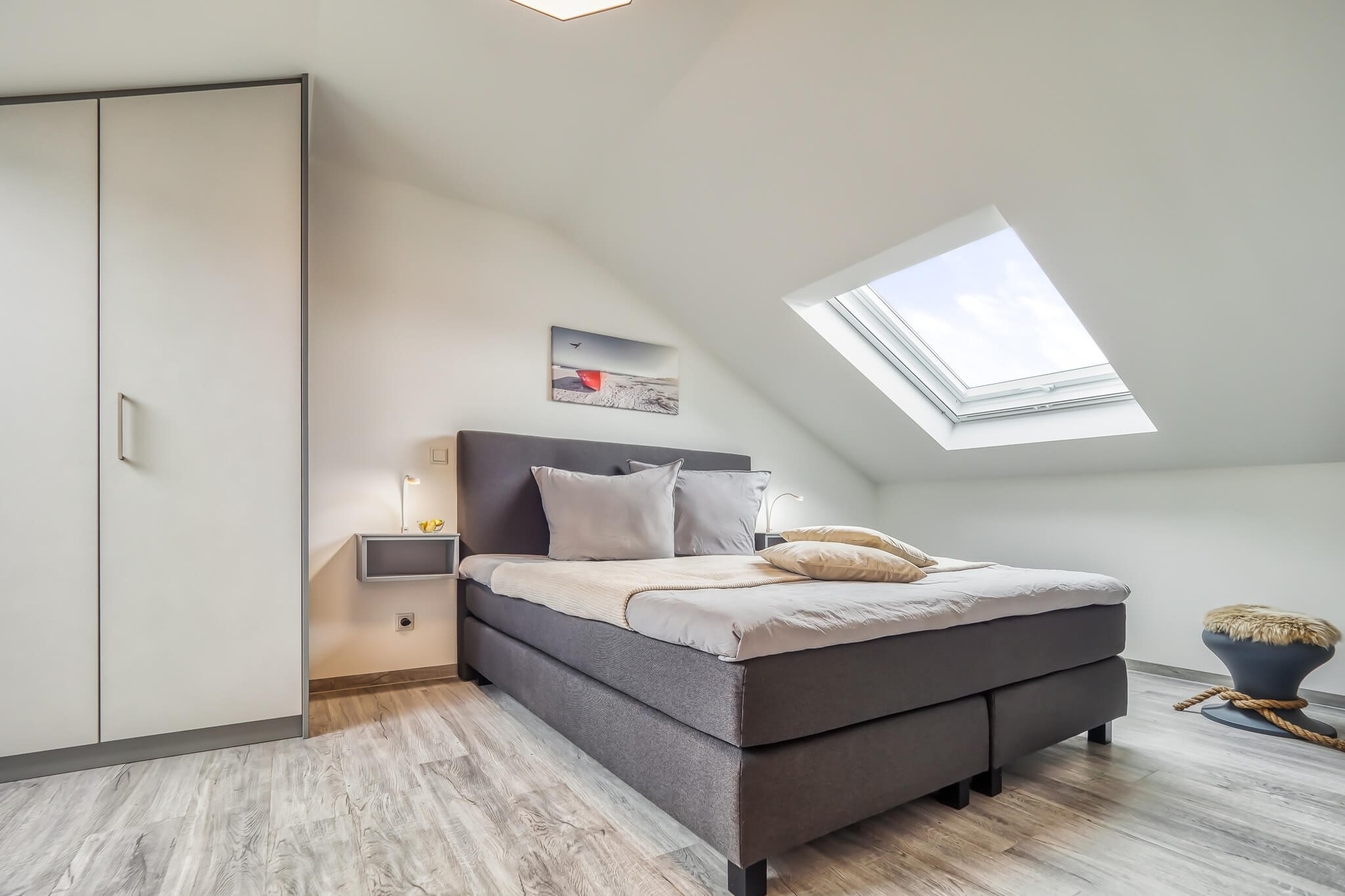 Das große Schlafzimmer mit Giebel und Dachflächenfenster besitzt ein Boxspringbett (180 x 200) mit durchgehendem Topper, Kleiderschränke und 43SAT-LED-TV. Des Weiteren befindet sich hier die eigene Sauna.