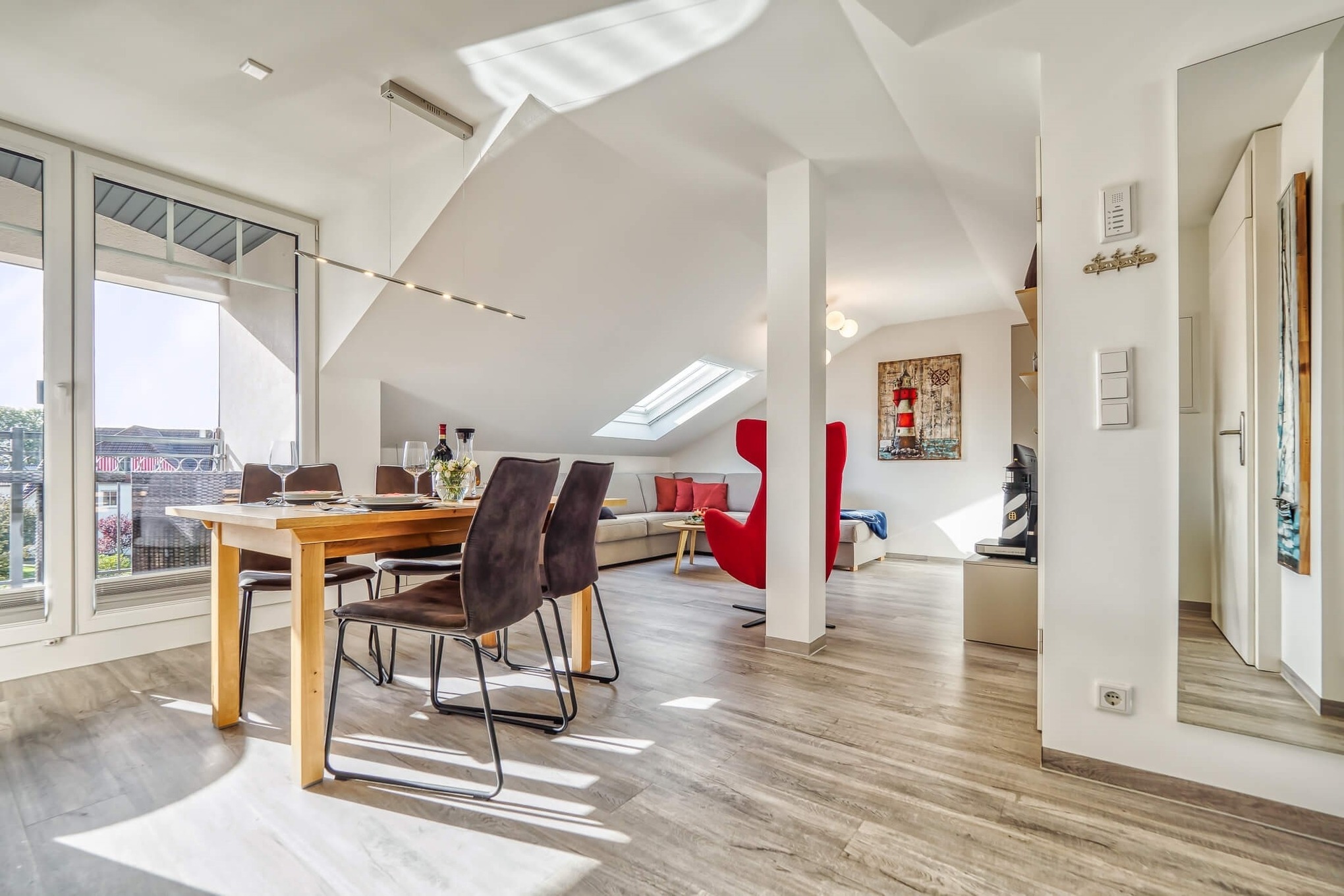 Diese helle und moderne Ferienwohnung wurde 10/2021 fertiggestellt. Die Ferienwohnung mit Sauna bietet auf ca. 57 qm Platz für maximal 4 Personen. Sie befindet sich im Dachgeschoss einer Stadtvilla und ist über den Fahrstuhl direkt erreichbar. Die 3-Raum-Wohnung ist zentral, nahe der Fußgängerzone, gelegen. Der weiße Sandstrand sowie der Zingster Hafen am Bodden sind in nur wenigen Gehminuten erreichbar. Restaurants, Einkaufsmöglichkeiten, Bäcker und Fahrradverleih befinden sich in unmittelbarer Nähe.