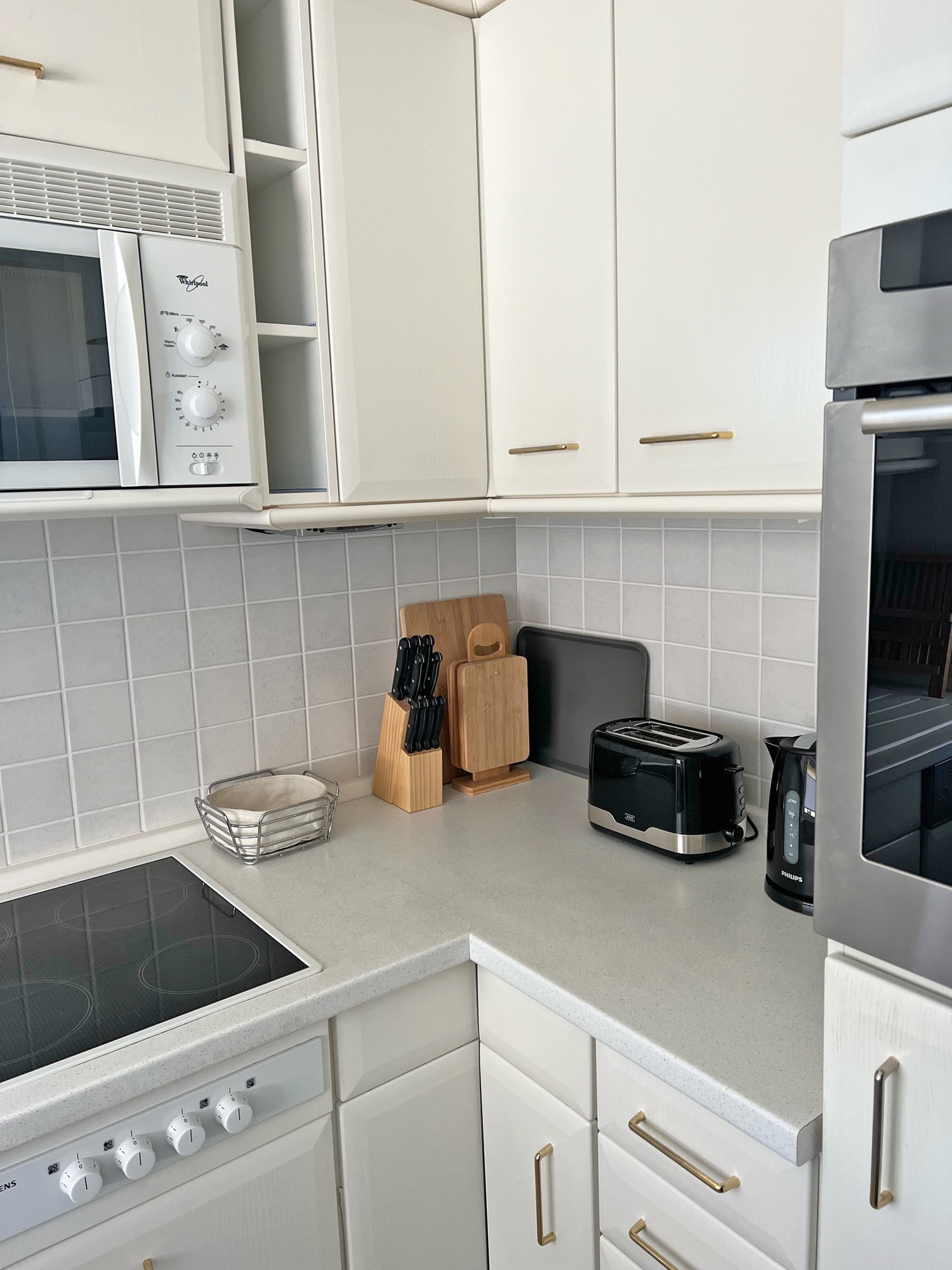 Vom Flur aus erreichen Sie alle weiteren Räume. Das Bad ist mit Dusche, WC, Waschtisch, einem Spiegel, sowie einem beheizbaren Handtuchhalter ausgestattet. Das separate Schlafzimmer ist mit einem Doppelbett (90x200cm), zwei Nachttischen, einem großen Schrank und Verdunkelungsmöglichkeiten eingerichtet. Die Küche ist komplett ausgestattet und bietet Ihnen alle notwendigen Küchenutensilien.