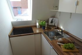 Die Küche ohne Wege ist klein, aber ausgestattet mit: Kaffeemaschine, Toaster, Wasserkocher, Kühlschrank (ohne Gefrierfach), Ceranfeld mit 4 Feldern. Sie finden ausreichend Geschirr, Töpfe, Gläser und Küchenutensilien vor.