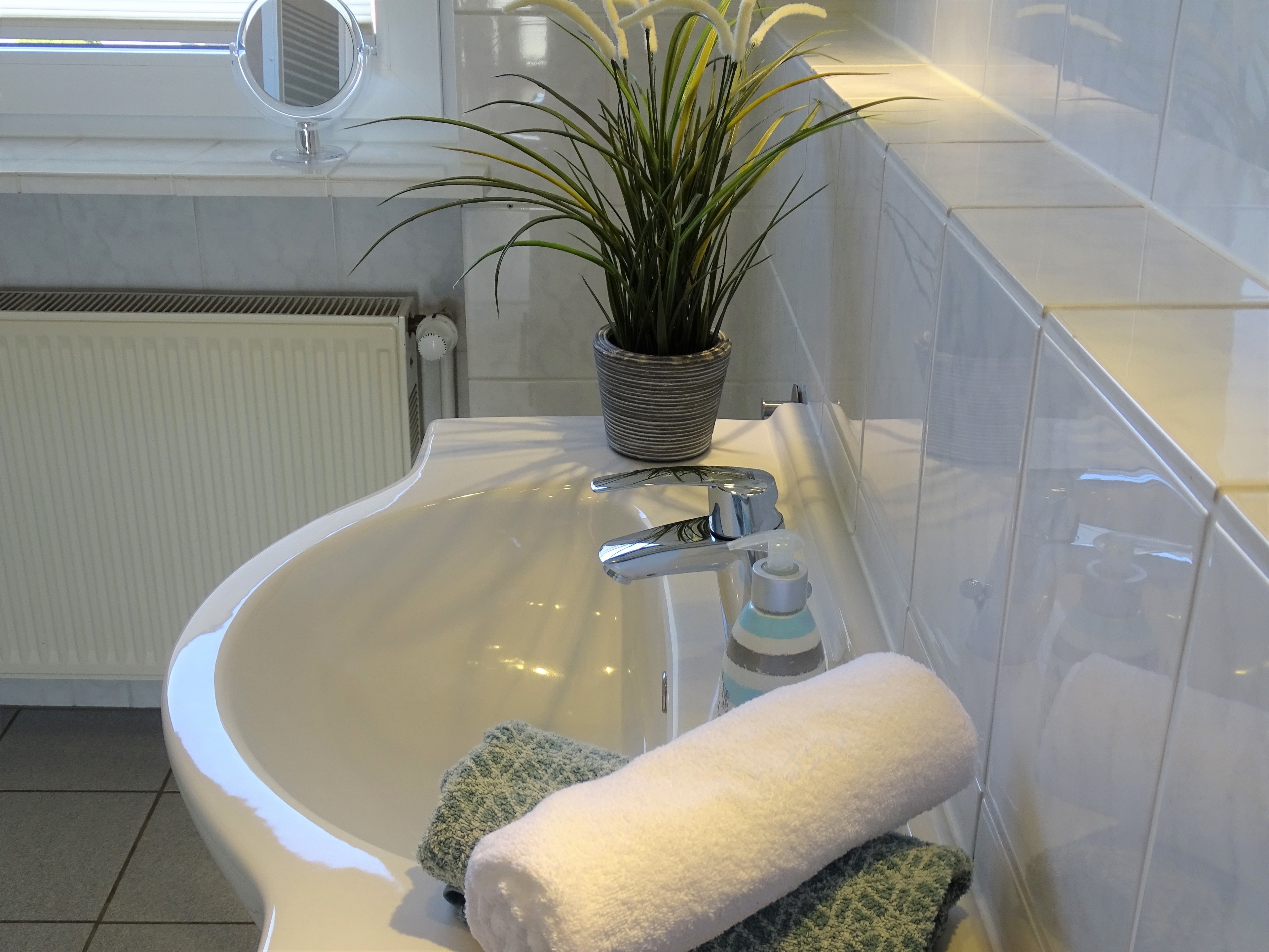 Das große Badezimmer verfügt über eine 1,20 x 0,85 m Dusche mit Trennwand. Kosmetikspiegel, Waage und Föhn gehören mit zur Ausstattung.