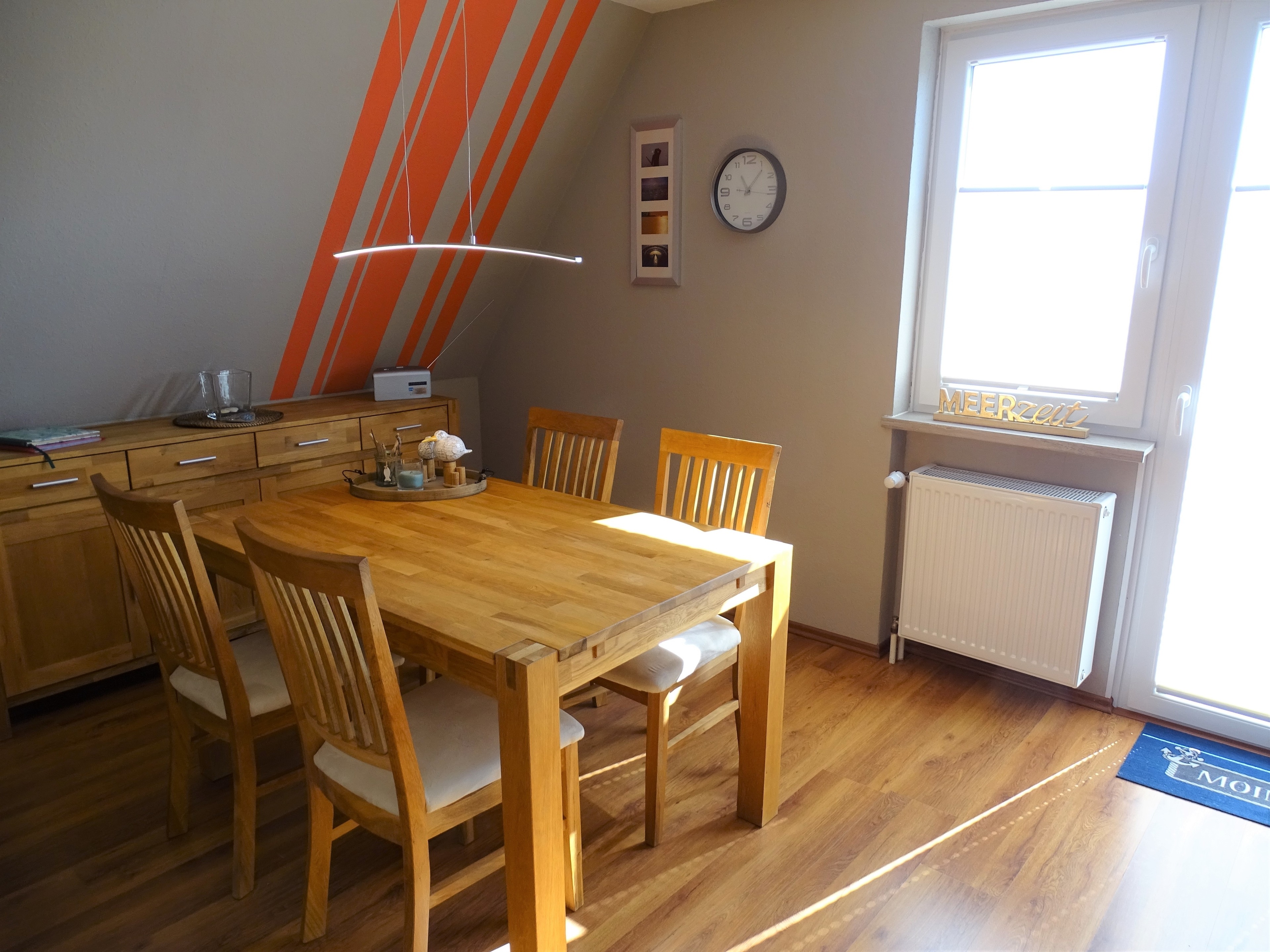 Im Essbereich befindet sich ein Sideboard mit Geschirr und ein großer Esstisch mit 4 Stühlen.