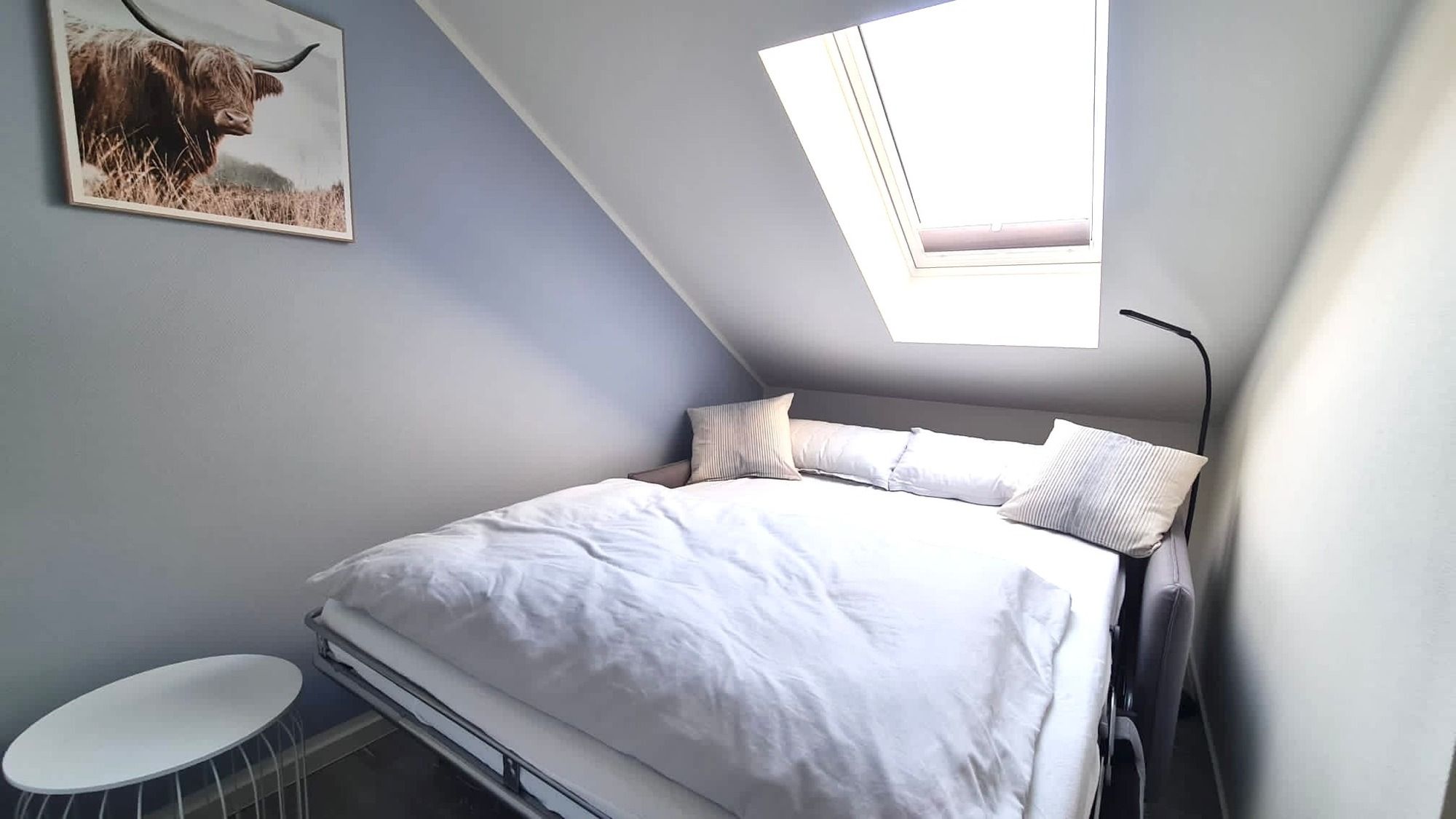 Das Boxspringbett im Schlafzimmer und das Schlafsofa mit Matratze und Lattenrost im weiteren