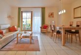 Sie verfügt über einen großzügigen Wohn-/Essbereich mit Sofa einem Couchtisch, Sideboard mit Flachbild-TV, großem Esstisch mit 4 Stühlen sowie Zugang zur Terrasse. Die kleine, funktionale Küche ist ausgestattet mit Herd mit Ceranfeld (ohne Backofen), Kühlschrank mit TK-Fach, Geschirrspülmaschine, Kaffeemaschine, Toaster, Wasserkocher und Mixer.