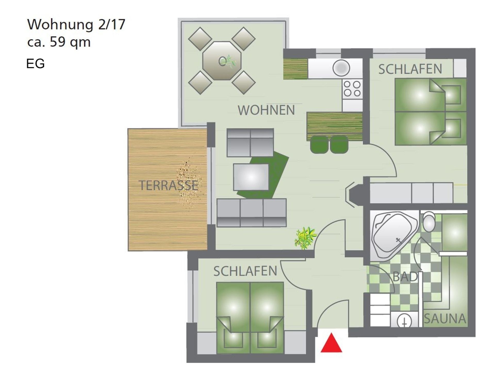 Die Wohnung befindet sich im Erdgeschoss. Die Terrasse ist nach Süd-Westen ausgerichtet.