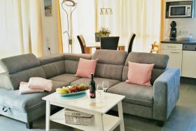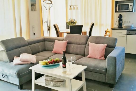 Unsere neue schöne Ferienwohnung ist mit allen Annehmlichkeiten ausgestattet, die man sich im Urlaub wünscht: zwei Schlafzimmer mit je einem Boxspringbett und zusätzlichem Fernseher, ein gemütlicher Wohnraum mit Essecke, Internetzugang und eine moderne offene Küche, natürlich mit Spülmaschine, Senseo Kaffepad Maschine und Backofen. Über ein Fußbänkchen im Bad, Steckdosensicherungen, Bücher, Spiele und Kinderspielzeug freuen sich nicht nur die kleinen Gäste, denn es entlastet auch das Urlaubsgepäck.
