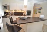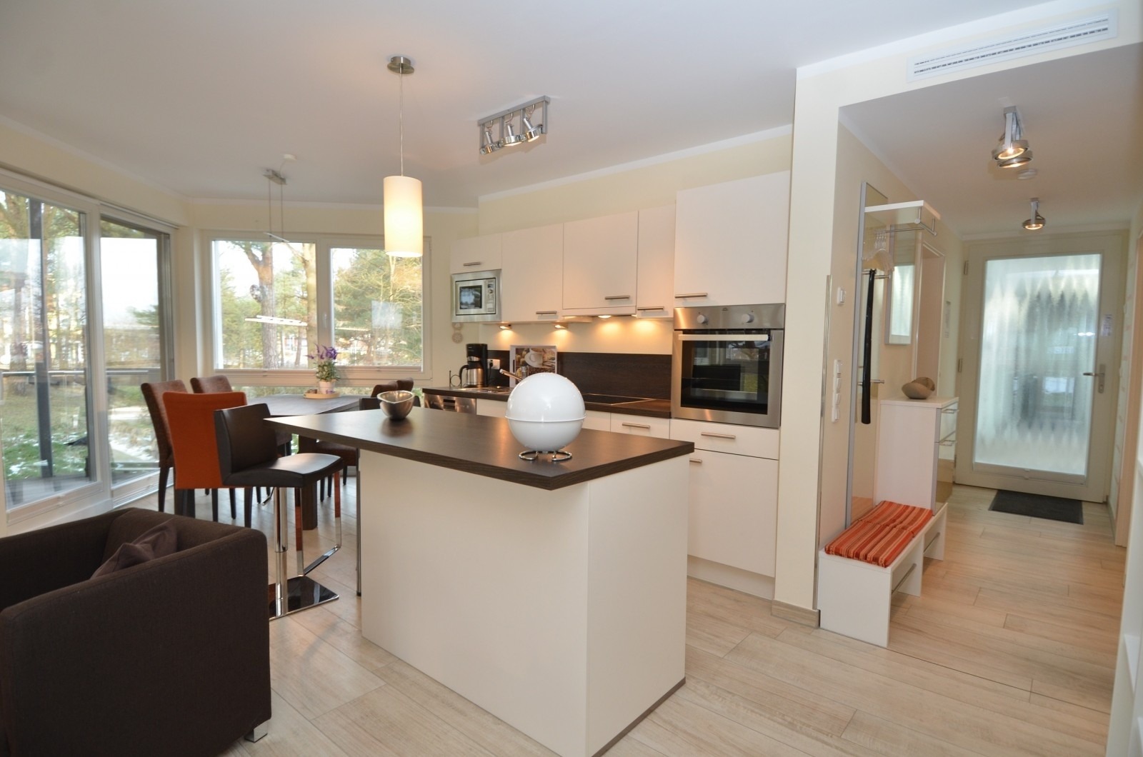 Die offene Küche mit hellem Essbereich und einem integriertem Tresen lädt zum Verweilen ein. Auf dem großzügigen Balkon finden Sie bequeme Gartenmöbel und einen Strandkorb. Lauschen Sie hier am Abend bei einem leckeren Getränk dem Rauschen der Wellen.