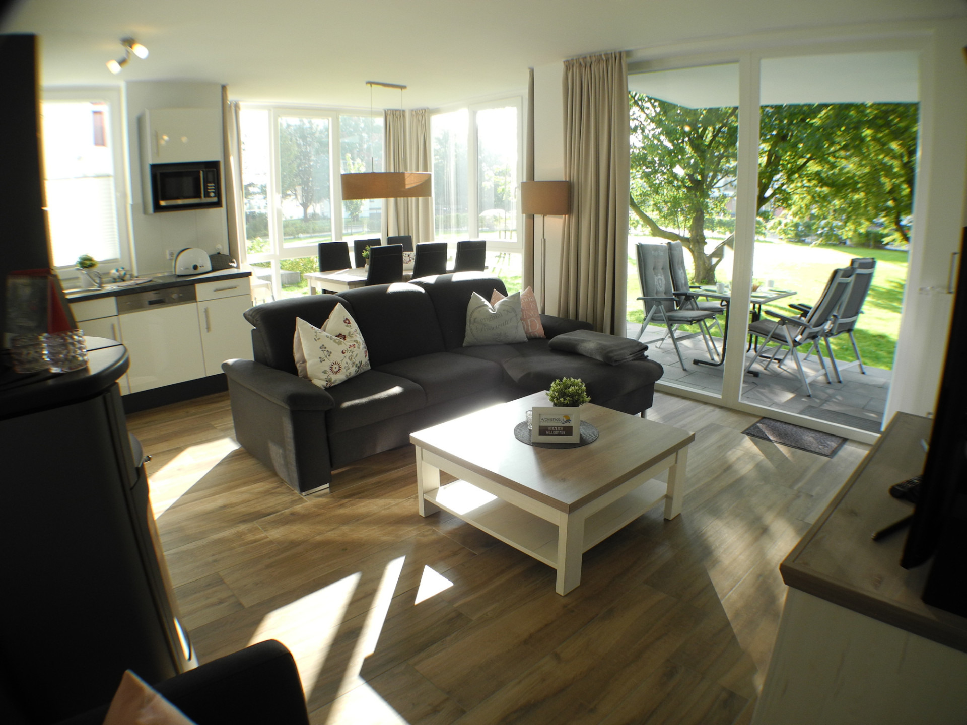 Der große Wohnraum lädt vor allem an den kälteren Tagen, vor dem knisternden Kamin, mit einem tollen Buch und einem guten Glas Wein zu einem entspannten Abend ein.
