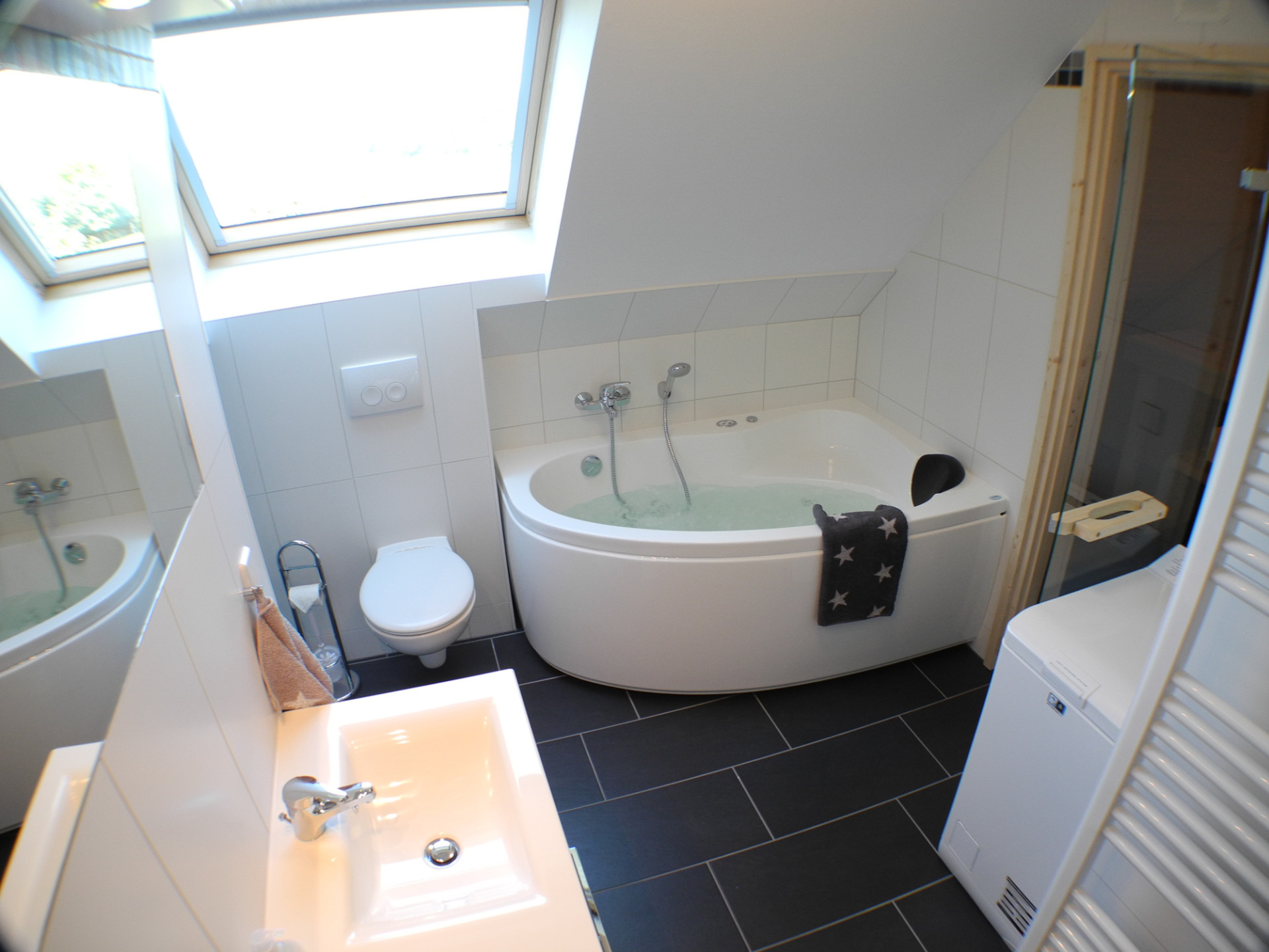 Im großen Badezimmer mit Doppelwaschbecken bietet sich Ihnen mit einer Eckbadewanne und einer Sauna ein entspannender Wellnessbereich. Ein Gäste-WC ist zusätzlich vorhanden.