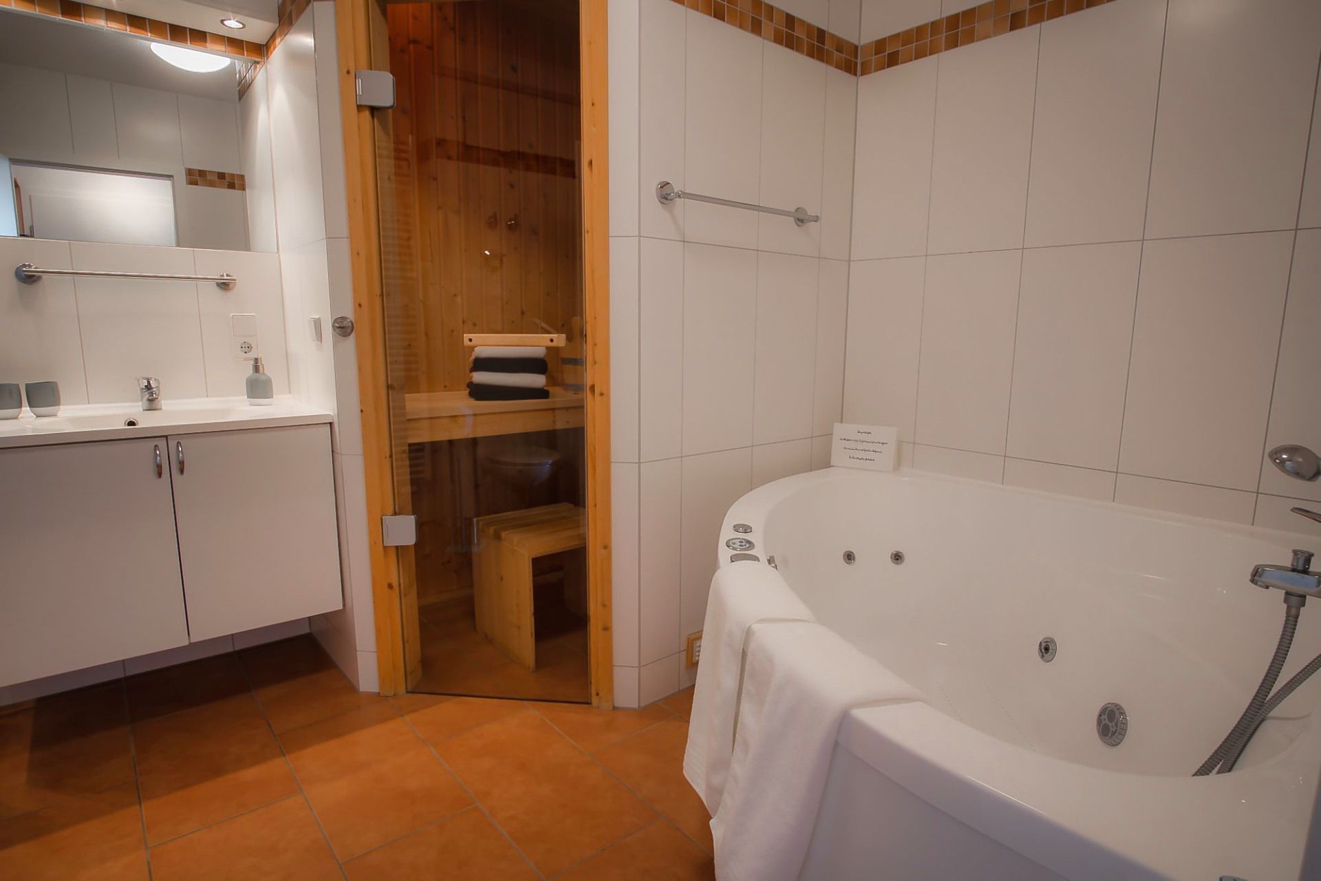 Das geräumige Badezimmer ist mit einem Whirlpool, einer Sauna, sowie einer Dusche und einer Waschmaschine/ -trockner ausgestattet.