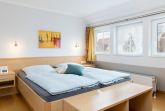 Das kleinere Schlafzimmer ist mit Einzelbett (90 x 200 cm) ohne Fußteil und Kleiderschrank sowie Stuhl und Ablagemöglichkeiten ausgestattet. Die Fußböden sind ausgelegt mit Kork – allergikerfreundlich.
