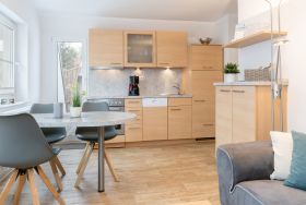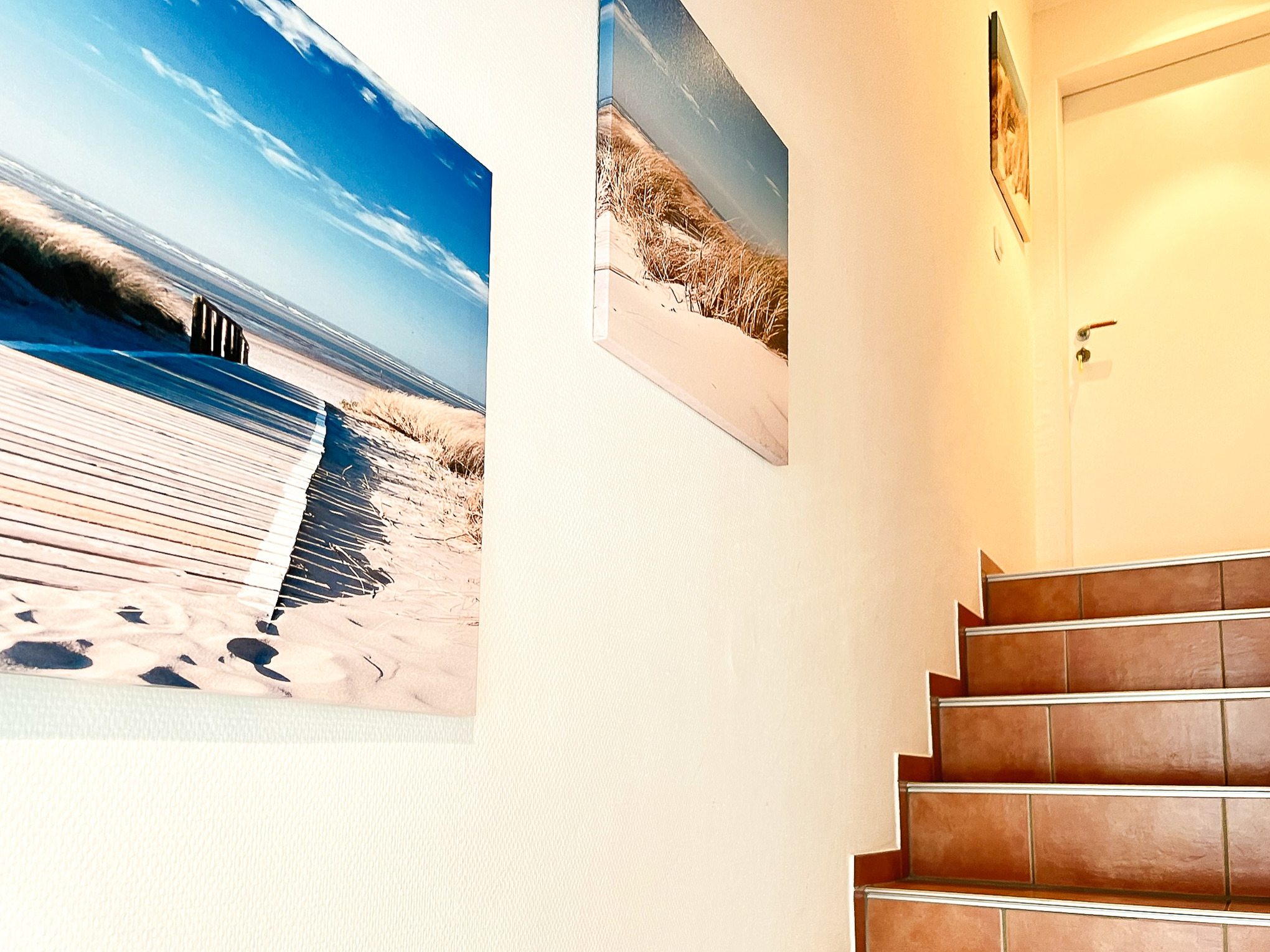 Die 3-Zimmer-Wohnung (55 qm) in der ersten Etage mit 16 qm Dachterrasse erlaubt sogar einen kleinen Blick über den Deich auf die Ostsee. Mit den 2 Schlafräumen ideal für die kleine Familie oder auch 2 Erwachsene, die getrennte Schlafmöglichkeiten suchen – bis zu 3 Personen fühlen sich hier gleichermaßen wohl.