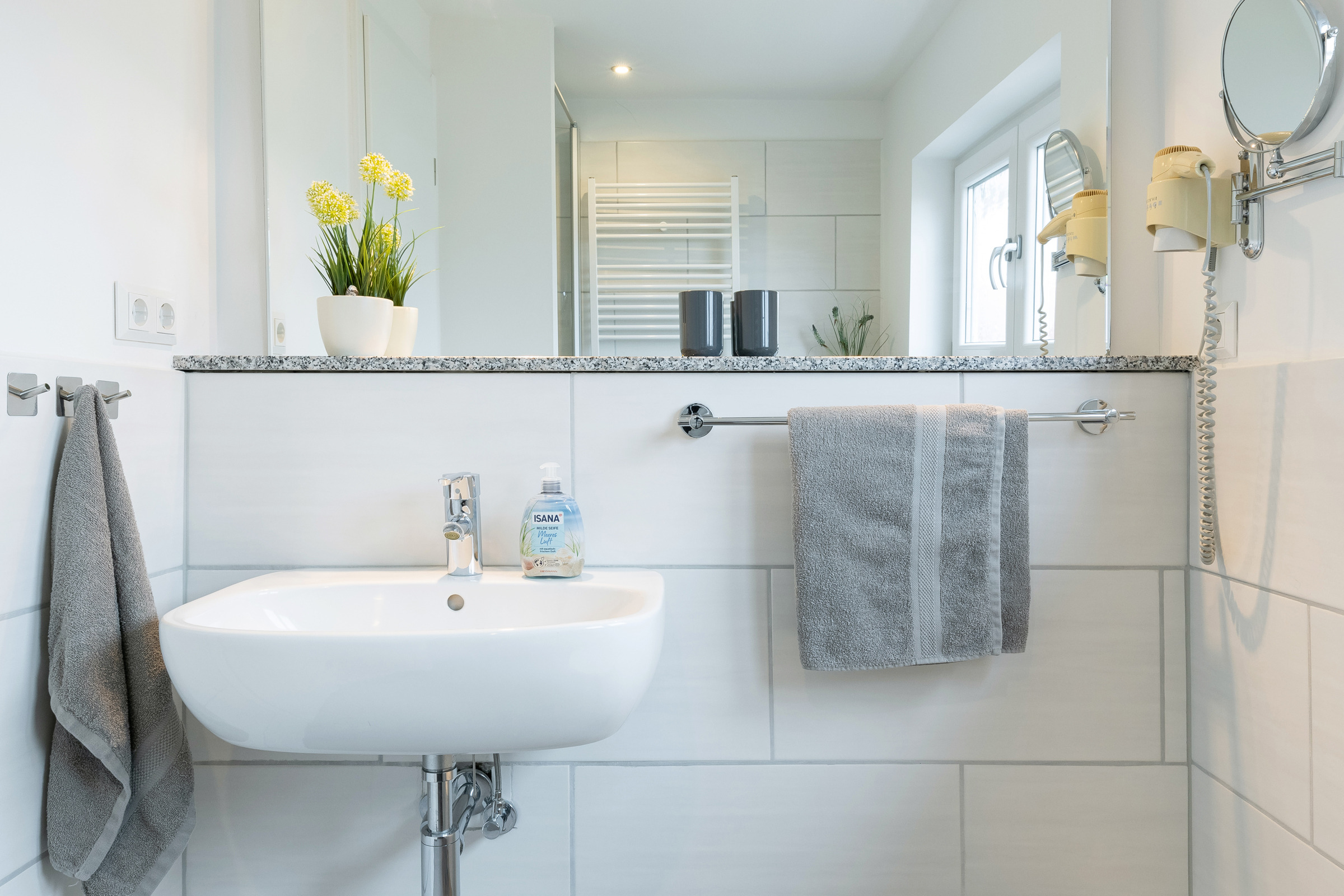 Das renovierte Bad hat eine große Bodendusche und ist ansprechend modern gestaltet.