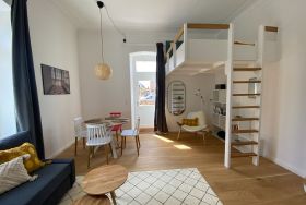 Beim Betreten der Ferienwohnung begrüßt sie der offene Wohn-, Ess- und Schlafbereich mit einer gemütlichen Polster-Sitzecke, die gleichzeitig als Schlafsofa für 2 Personen genutzt werden kann, einem Esstisch sowie dem Highlight der Wohnung, der Hochbett-Etage (1,60 x 2,00 m) für 2 Personen. Wir weisen ausdrücklich darauf hin, dass diese nur über eine Leiter erreichbar ist und nicht für Kleinkinder geeignet ist. Die Benutzung erfolgt auf eigene Gefahr. Eine Fellnase ist in der Ferienwohnung willkommen.