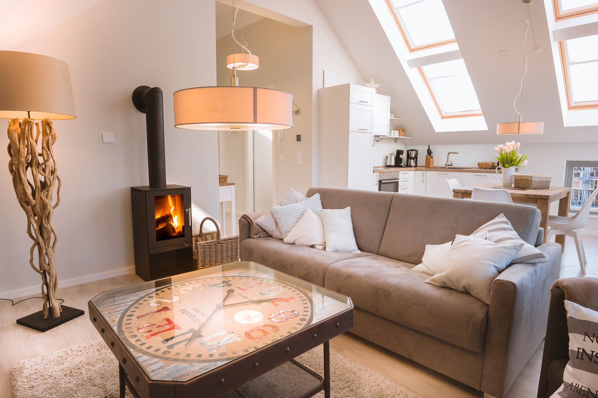 In den kühleren Monaten sorgt ein knisternder Kaminofen für die Gemütlichkeit.