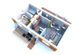 Das Schlafzimmer ist mit einem Doppelbett und einem Multifunktionsbett ausgestatt, das entweder als Couch, Einzelbett, Doppelbett oder Stufenbett genutzt werden kann. Ideal für 3 Erwachsene in der Schlafaufteilung 2 : 1 oder mit Kindern/Jugendlichen 2 : 2. Selbstverständlich trennt eine Schiebewand beide Schlafbereiche voneinander ab. Auch von hier gibt es einen ebenerdigen Zugang zur Ost-Terrasse.