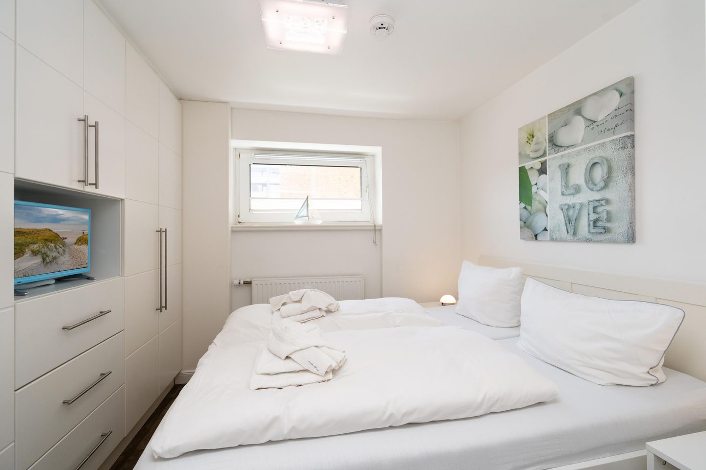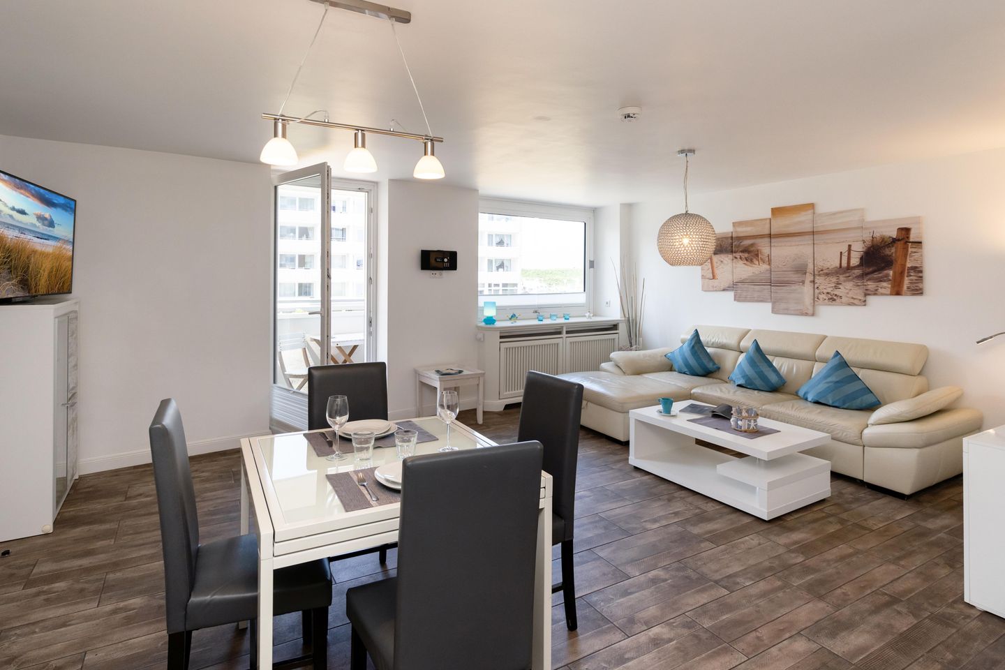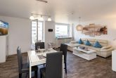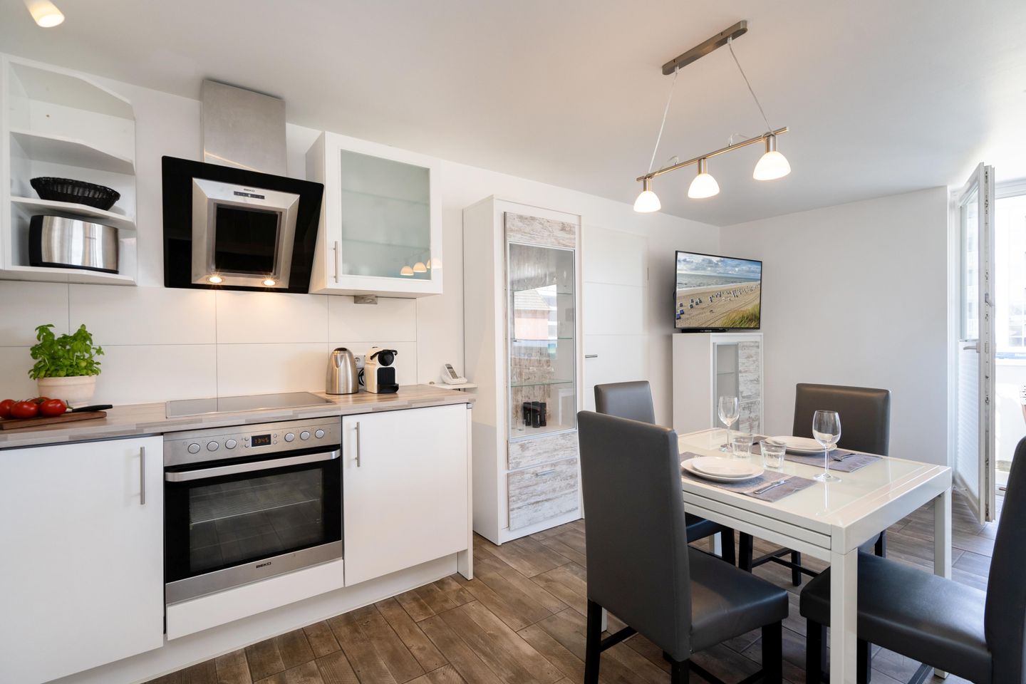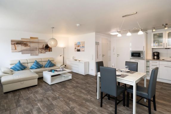 Diese moderne ca. 49 m² große 2-Zimmer Ferienwohnung für bis zu 2 Personen befindet sich im ersten Stock eines Appartementhauses in einer stadt- und strandnahen Lage von Westerland. Es erwartet Sie eine offene, voll ausgestattete Küche mit angrenzendem Wohn- und Essbereich. Das großzügige Ledersofa sowie ein 47 Zoll Smart TV laden zur absoluten Entspannung ein. Durch das Ausziehen des Sofas entsteht eine weitere Schlafmöglichkeit. Das gemütliche Doppelschlafzimmer ist mit einem Flat TV ausgestattet und bietet durch Einbauschränke viel Stauraum. Das moderne Badezimmer verfügt über eine Dusche. Nutzen Sie gerne den schönen Westbalkon mit Blick auf den Strandübergang „Brandenburger Strand.“ Kostenloses WLAN, ein zugehöriger Tiefgaragenstellplatz (Einfahrtshöhe ca. 190 cm, Breite ca. 230, Länge ca. 440 cm) sowie eine Waschmaschine stehen Ihnen zur Verfügung. Haustiere sind erlaubt.