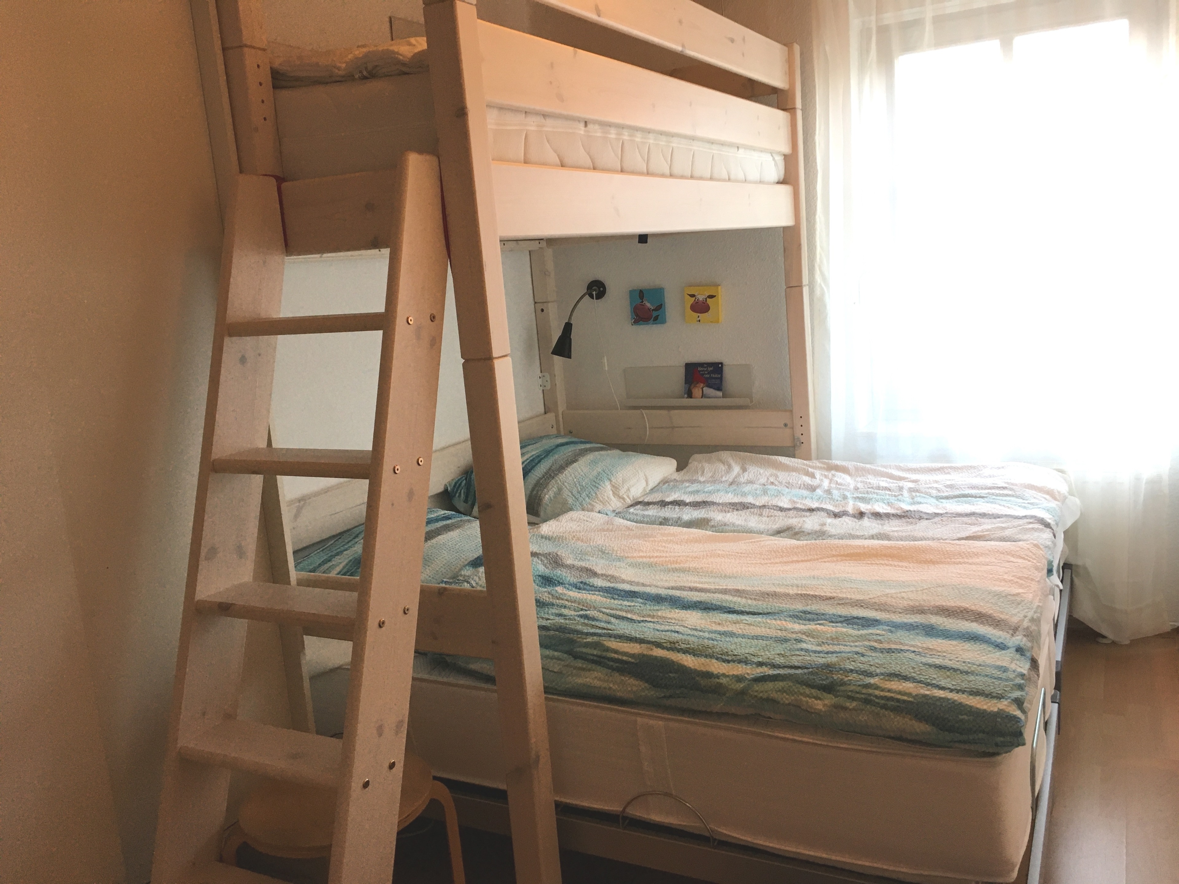 Das zweite Schlafzimmer ist mit einem stabilen Hochbett ausgestattet (100x200). Außerdem gibt es 2 Betten (90x190), die als Doppelbett oder als zwei Einzelbetten genutzt werden können. Die schräge Hochbett-Treppe ist für alle gut und sicher begehbar.