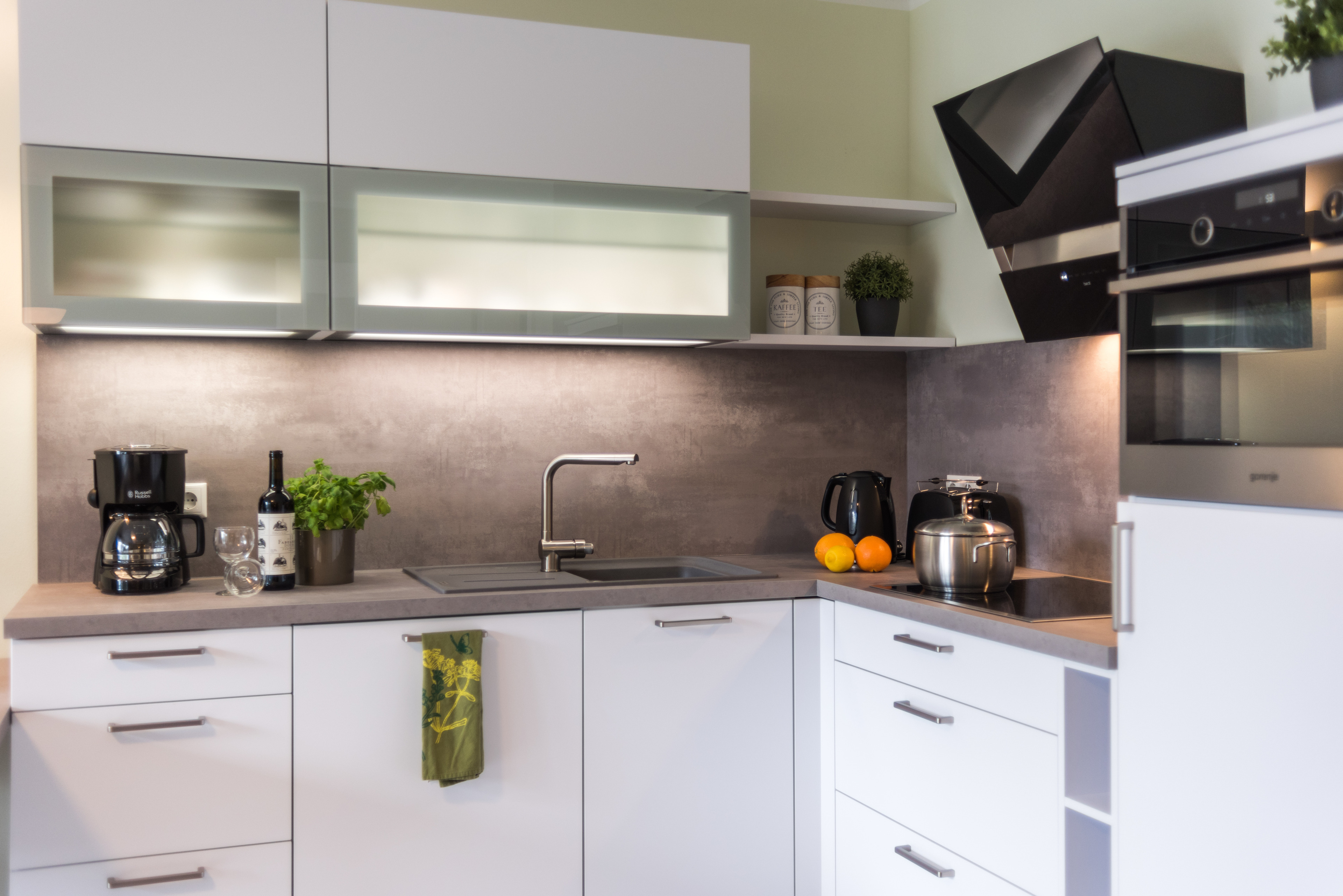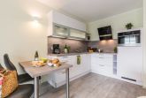 Flat Screen TV im Wohnzimmer, Bücher, voll eingerichtete Küchenzeile mit Geschirrspülmaschine, Kühlschrank, Cerankochfeld, Backofen, Kaffeemaschine, Wasserkocher, Toaster.