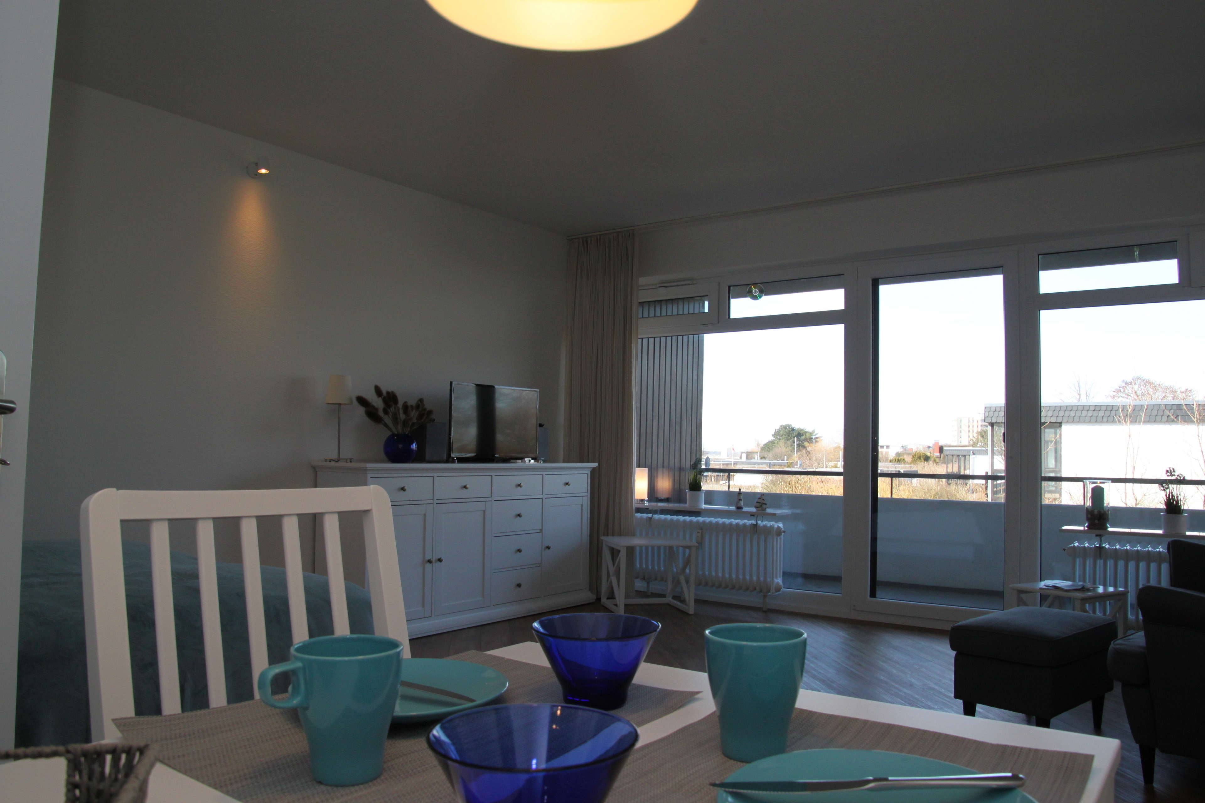 Bei schönem Wetter lädt der Balkon zum Relaxen ein, aber auch bei Regen und Sturm kann man den tollen Blick vom Wohnzimmer raus aufs Meer genießen. Zum Naturstrand sind es ca. 100 m, zum feinsandigen Südstrand mit Strandkörben nur ca. 500 m.