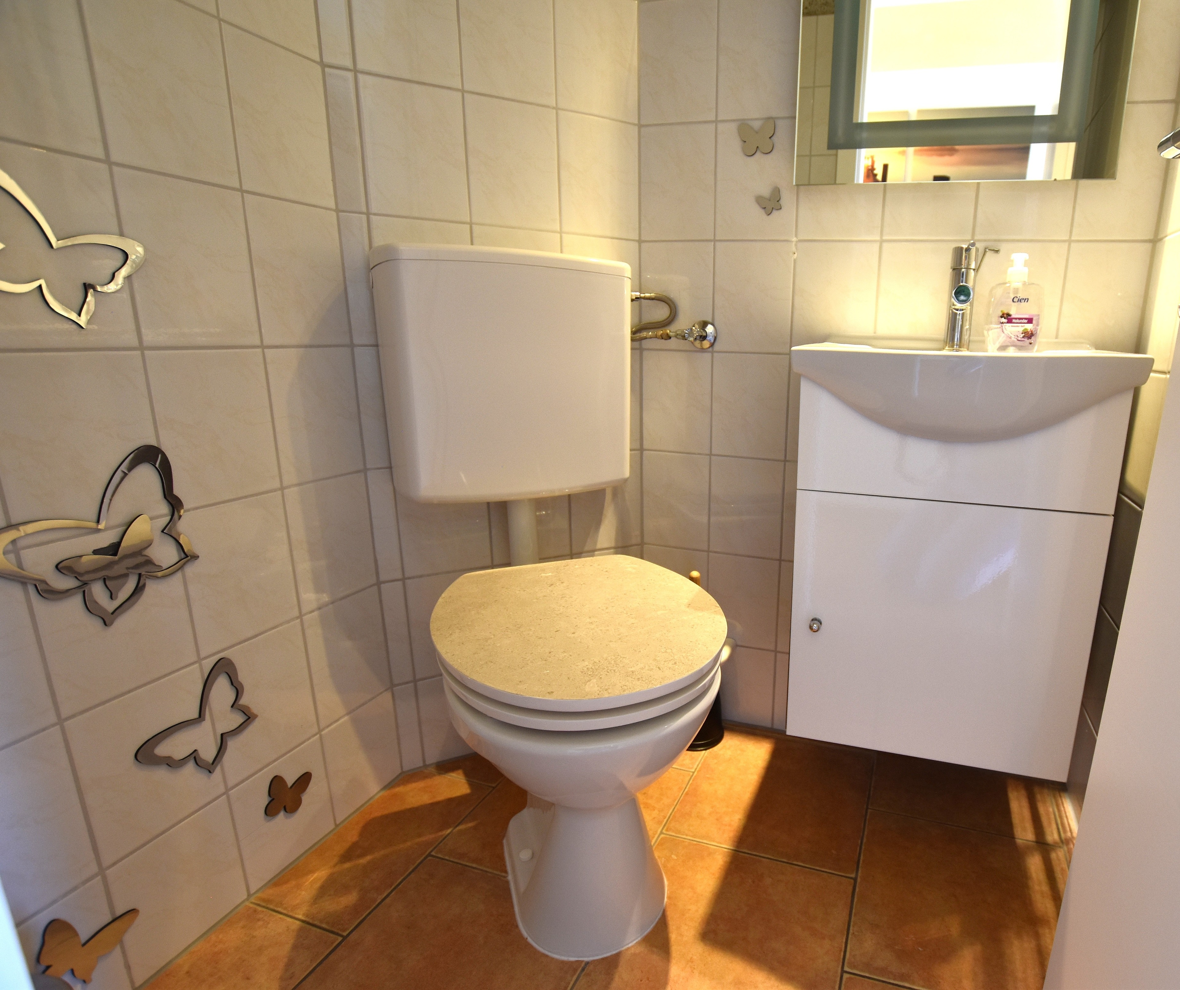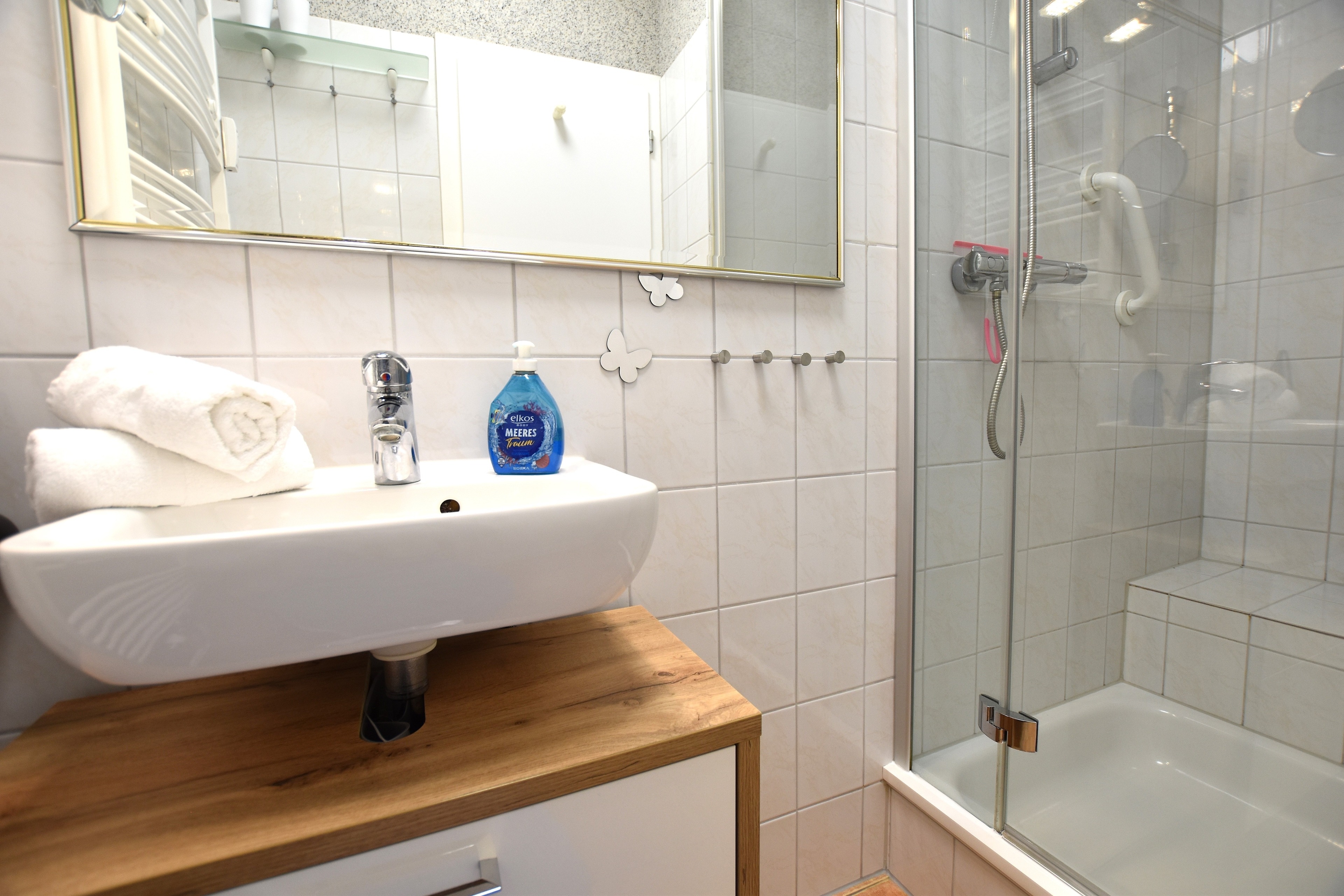 Duschbad mit Dusche, Waschbecken und Wandspiegel und ein separates WC.