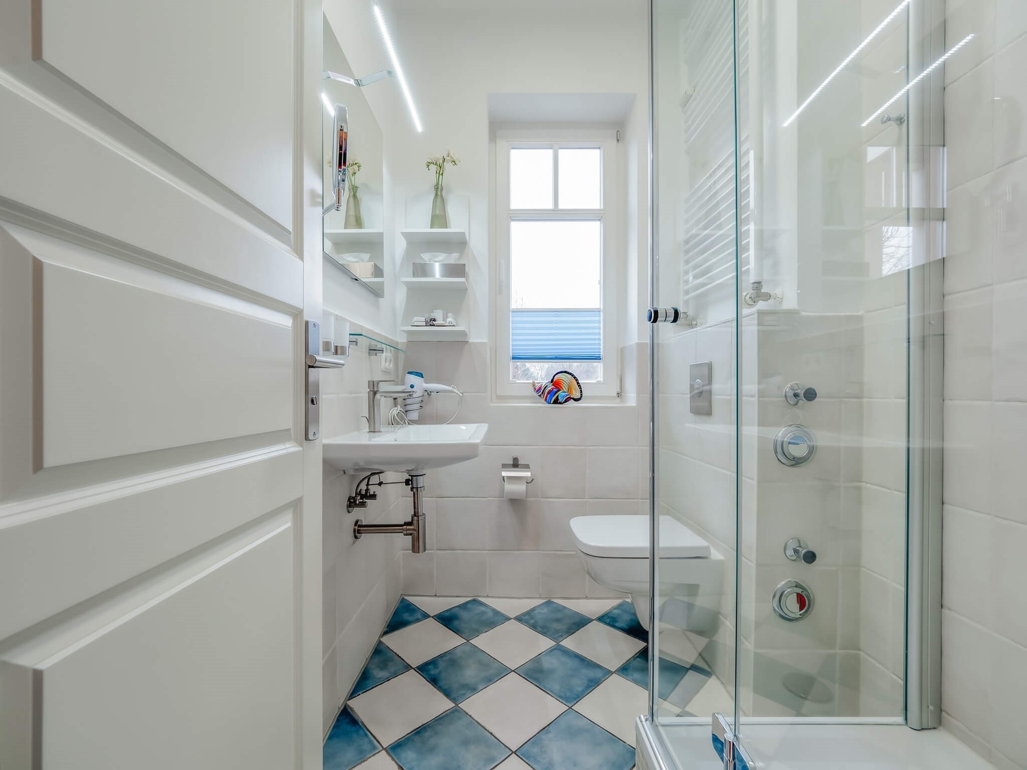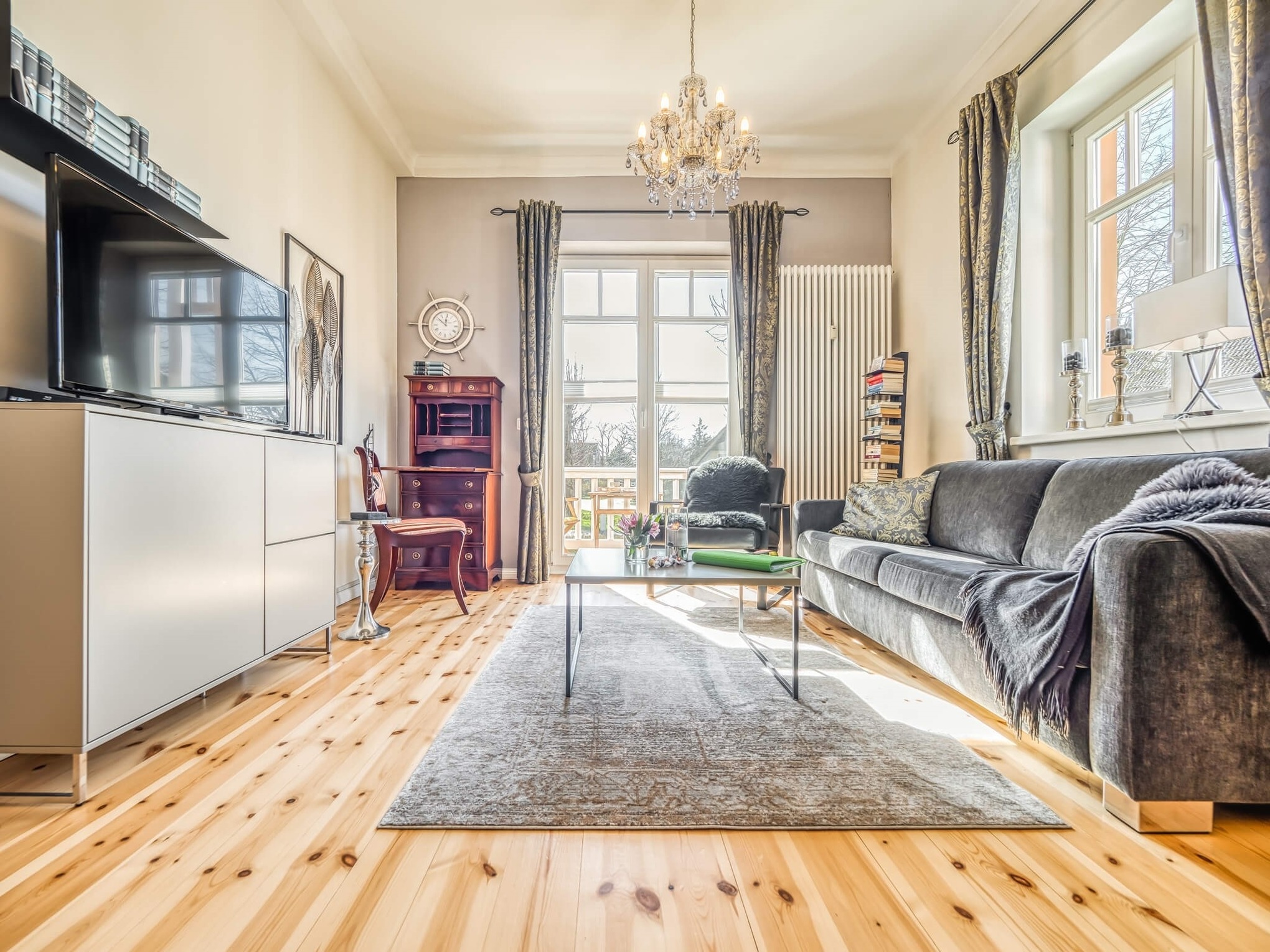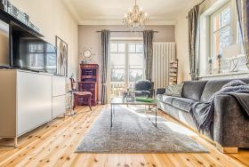 Die ruhig gelegene Wohnung mit Balkon befindet sich im Hochparterre einer komplett sanierten Gründerzeitvilla mit 330 cm hohen Decken und Dielenboden im Wohnbereich.