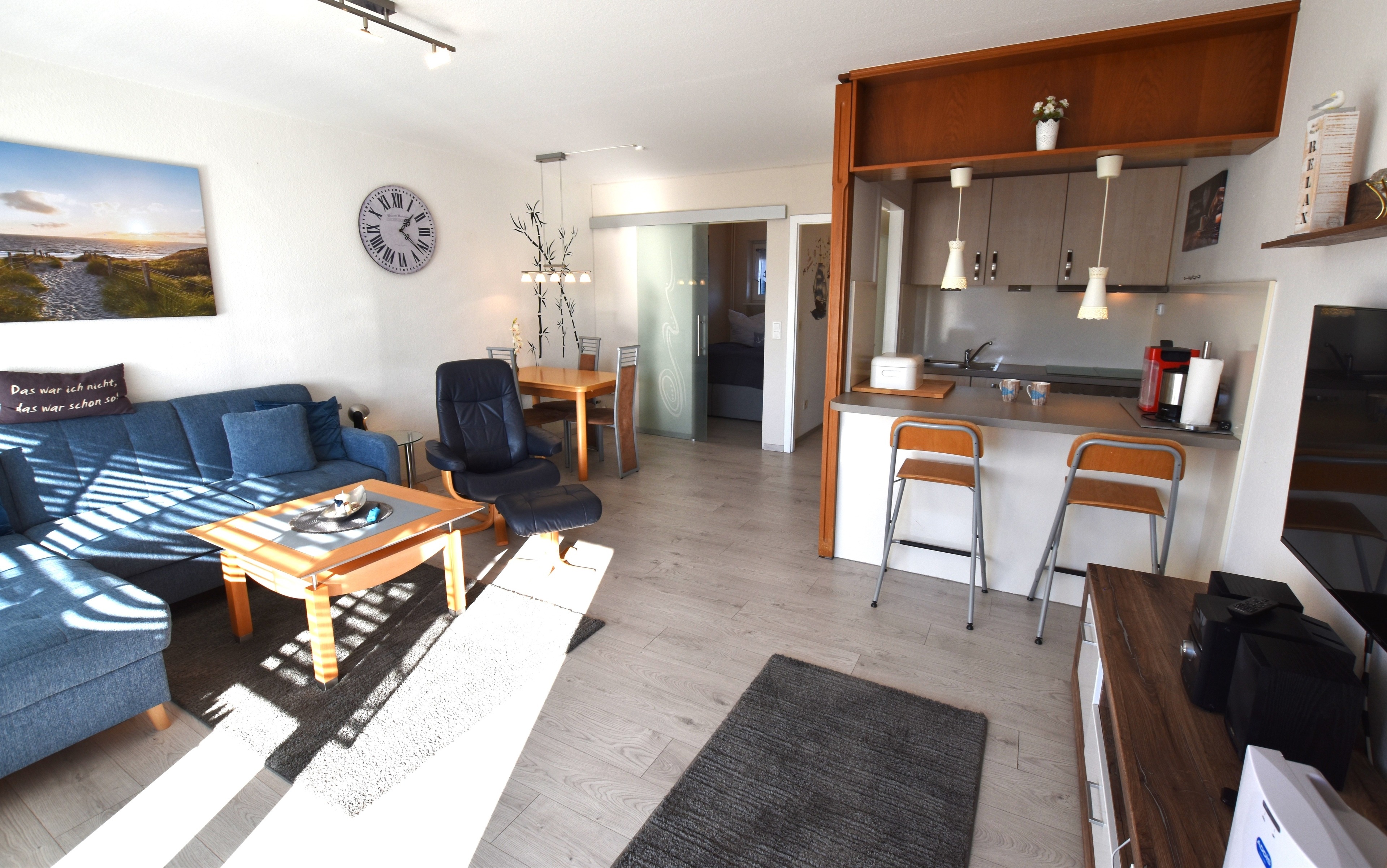 ein separates Schlafzimmer mit einem Doppelbett (1x160x200cm), einem Duschbad, Waschbecken und WC und einem großen Wohn/- Esszimmer mit neuer gut ausgestatter Küche, einer gemütlichen Schlafcouch (120x200cm), einem Esstisch mit Bestuhlung und großem LCD TV Gerät. Der an den Wohnbereich angrenzende Balkon ist mit Balkonmöbeln möbliert und befindet sich in südlicher Richtung.