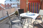 Ein überdachter Balkon mit Strandkorb und Sitzmöbeln lädt bei geeignetem Wetter zu Sitzen im Freien ein.