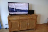 Ein internetfähiger Flachbild-TV mit DVBT-Receiver steht ebenso zur Verfügung wie eine kleine Stereokompaktanlage mit CD-Player.