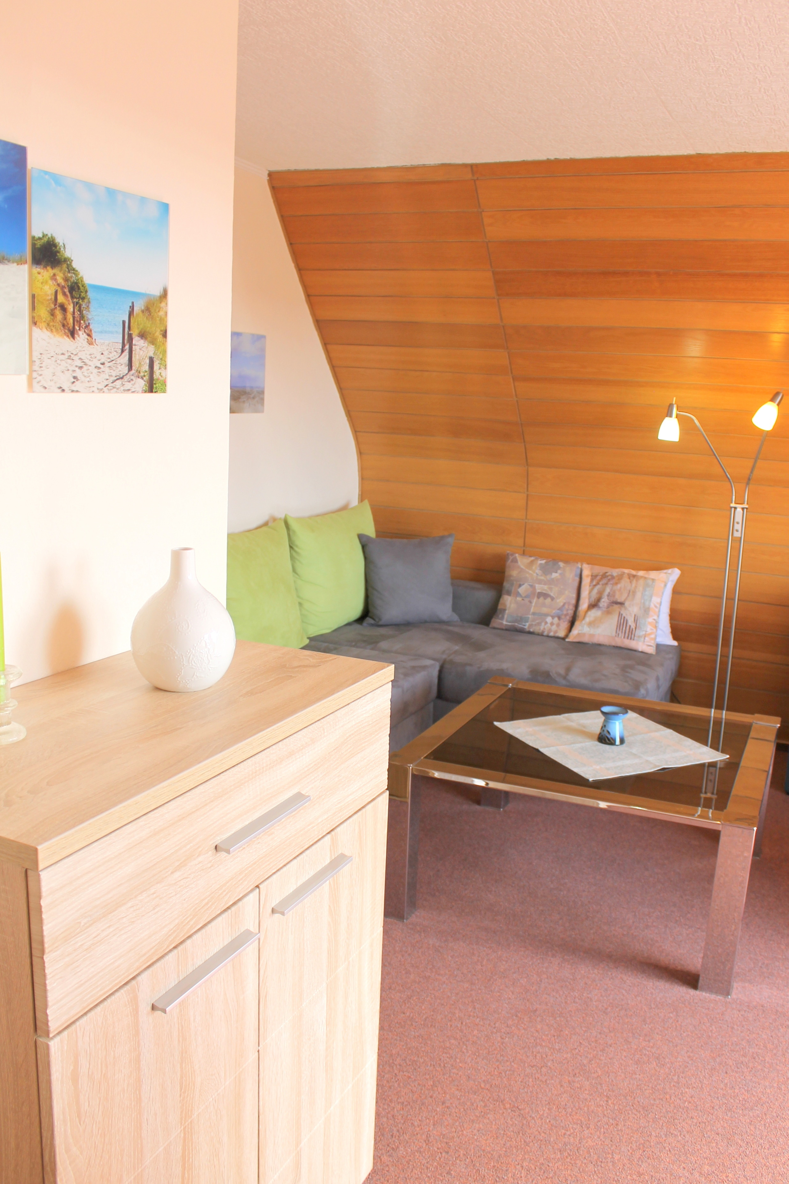 Die Ferienwohnung im Haus mit Herz & Sonne liegt in der 1. Etage und bietet Platz für bis zu vier Personen. Die Wohnfläche der ca. 70 m² großen Ferienwohnung verteilt sich auf ein Wohnzimmer, zwei Schlafzimmer, eine kleine separate Küche und das Badezimmer.