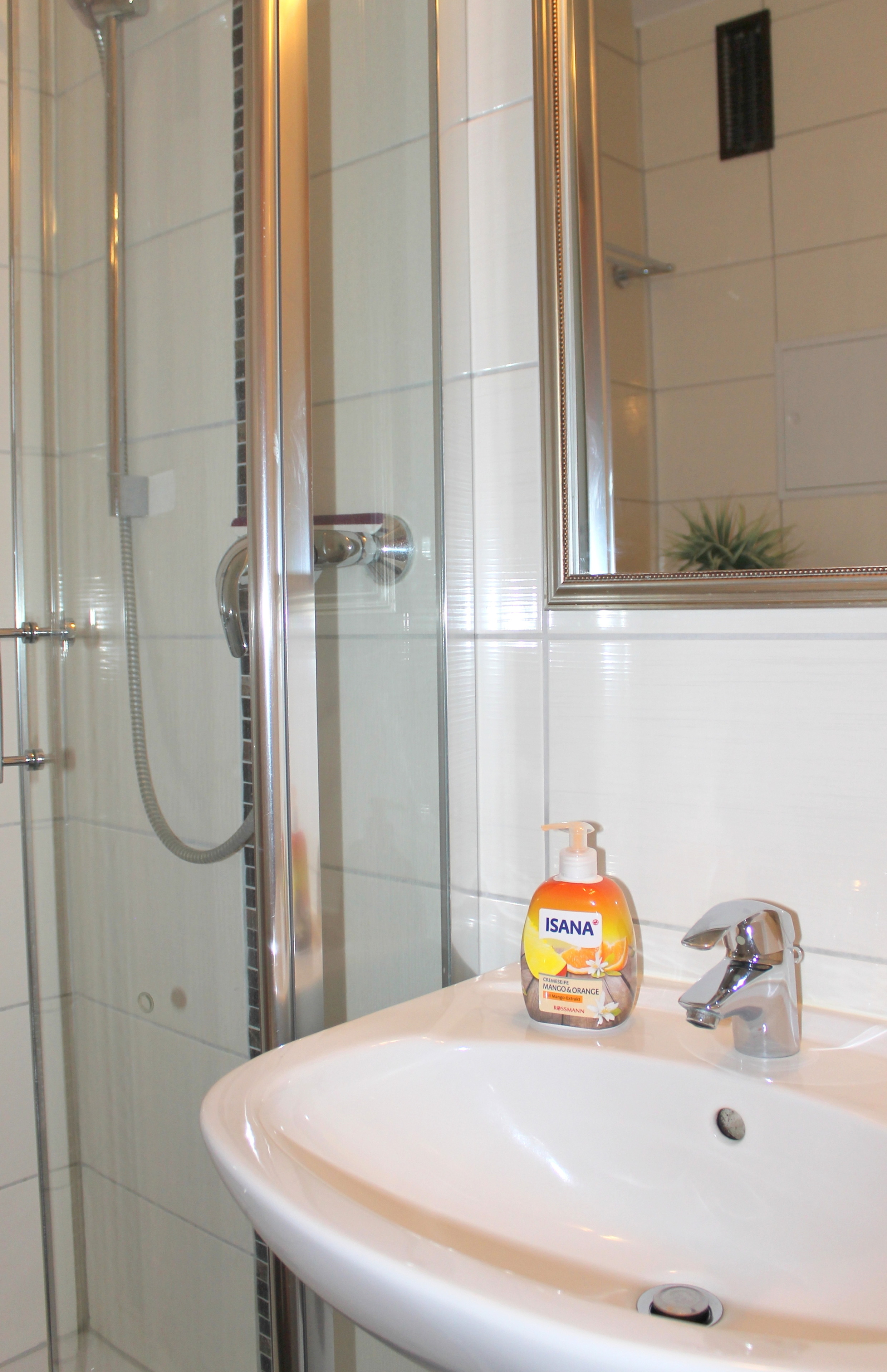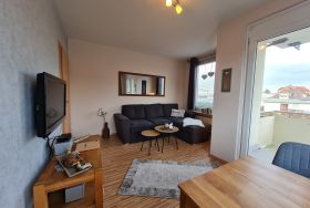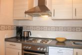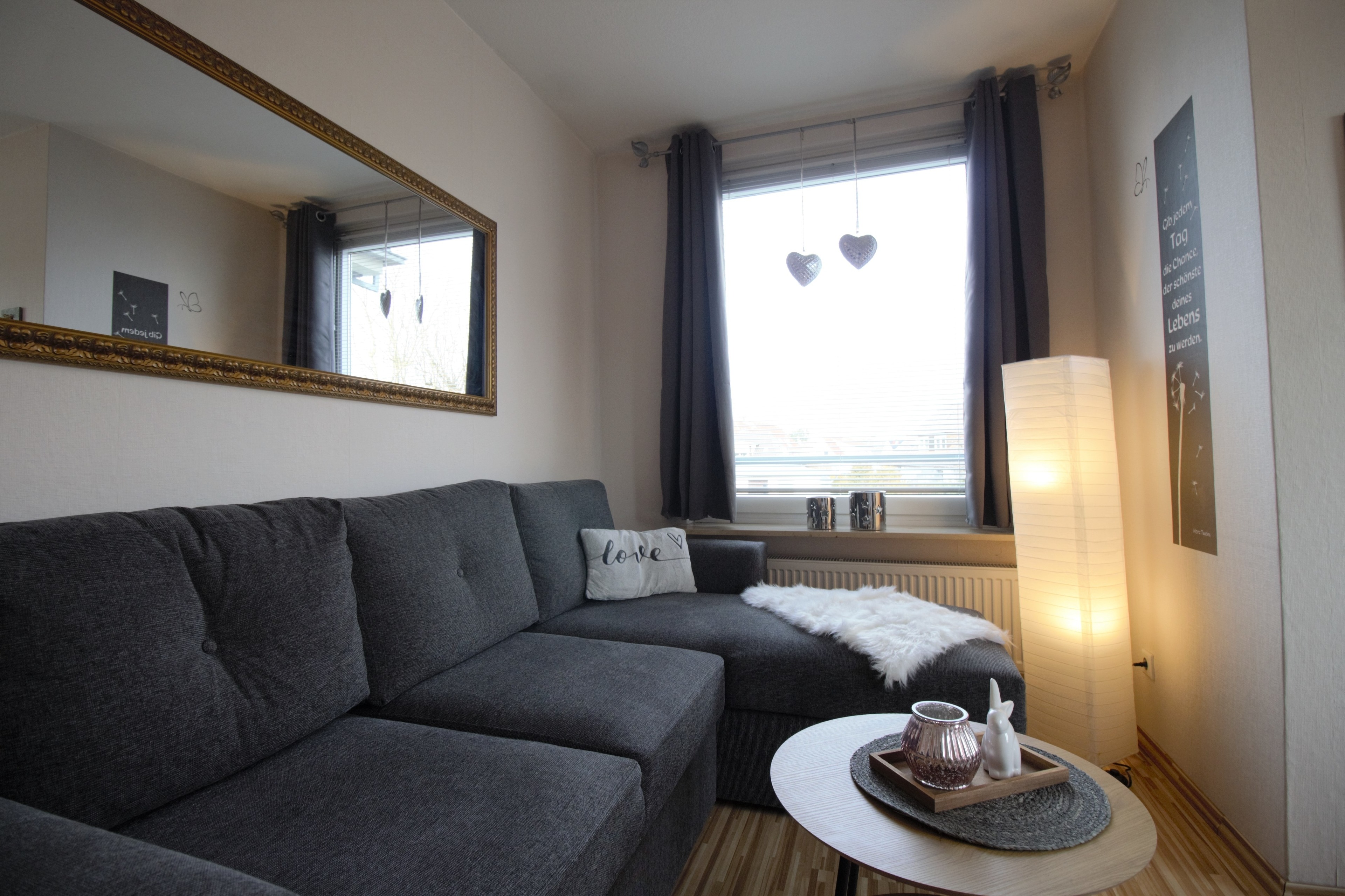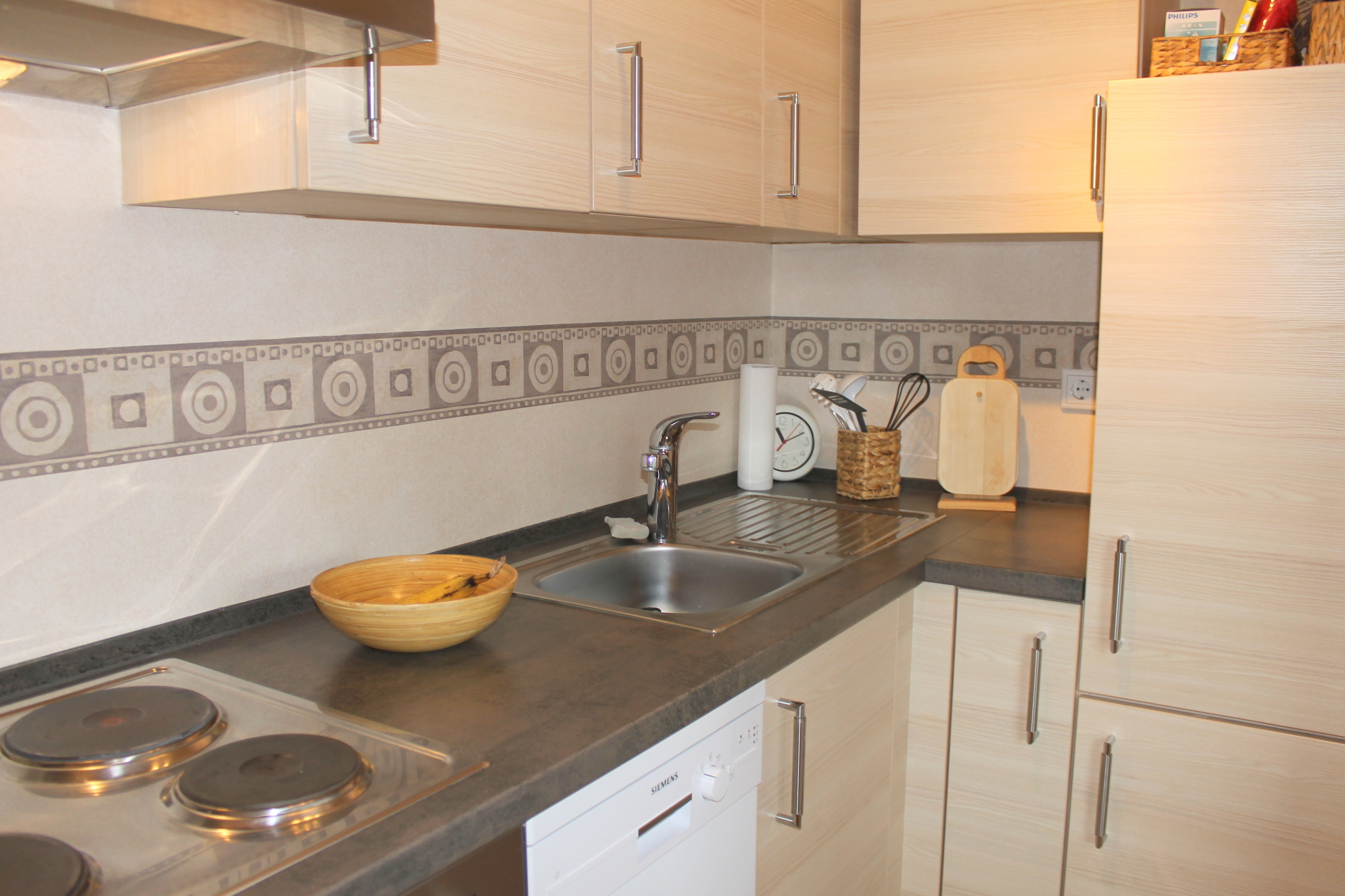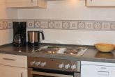 Der Wohnbereich ist mit einem gemütlichen Sofa mit Schlaffunktion für 2 Personen (1,80 x 2 m)und zwei Sesseln versehen, ebenso befindet sich hier ein Flachbild-TV, eine Stereoanlage mit Radio/CD, ein DVD-Player sowie ein Esstisch. Gleich neben dem Tisch befindet sich der Durchgang zur Küche. Vom Wohnbereich aus gelangen Sie auf den möblierten Balkon. Die separate Küche (ohne Tür zum Wohnzimmer) ist u. a. mit einem Backofen, einer kleinen Geschirrspülmaschine, einem Kühlschrank mit Gefrierfach, einem 4-Plattenherd und weiteren Küchengeräten ausgestattet. Das separate Schlafzimmer ist mit einem Doppelbett (getrennte Matratzen; offenes Fußende, 1,80 x 2 m), einem zweiten Flachbild-TV sowie zwei Herrendienern versehen. Im Flur befindet sich ein großer Einbauschrank. Das kleine Badezimmer ist mit Dusche/WC sowie einer Handtuchheizung ausgestattet. Alle Zimmer sind verdunkelbar. Die gesamte Wohnung ist mit Laminat ausgelegt.