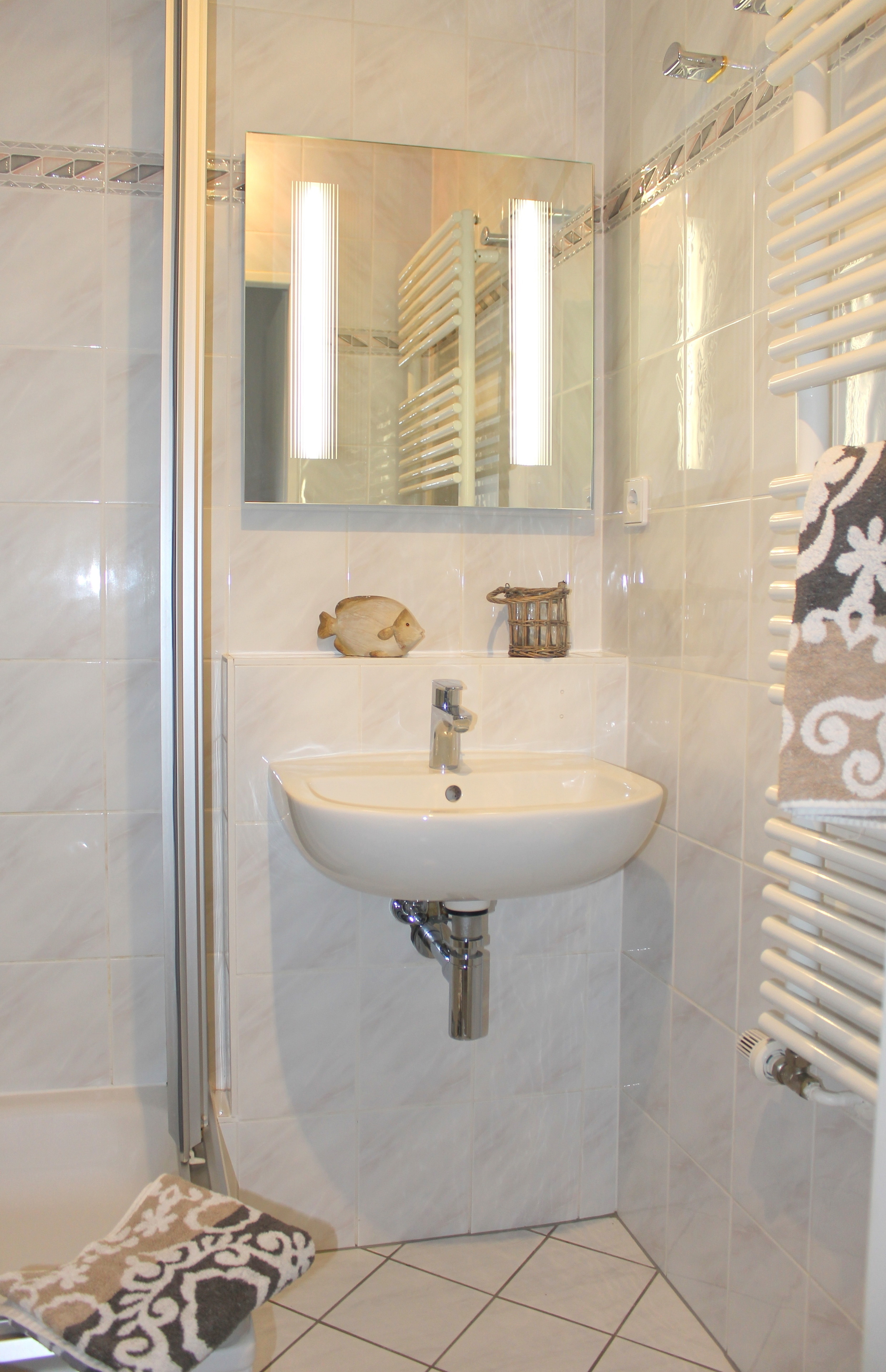 Im Badezimmer befinden sich neben Waschbecken und WC eine Dusche, sowie eine Handtuchheizung.
