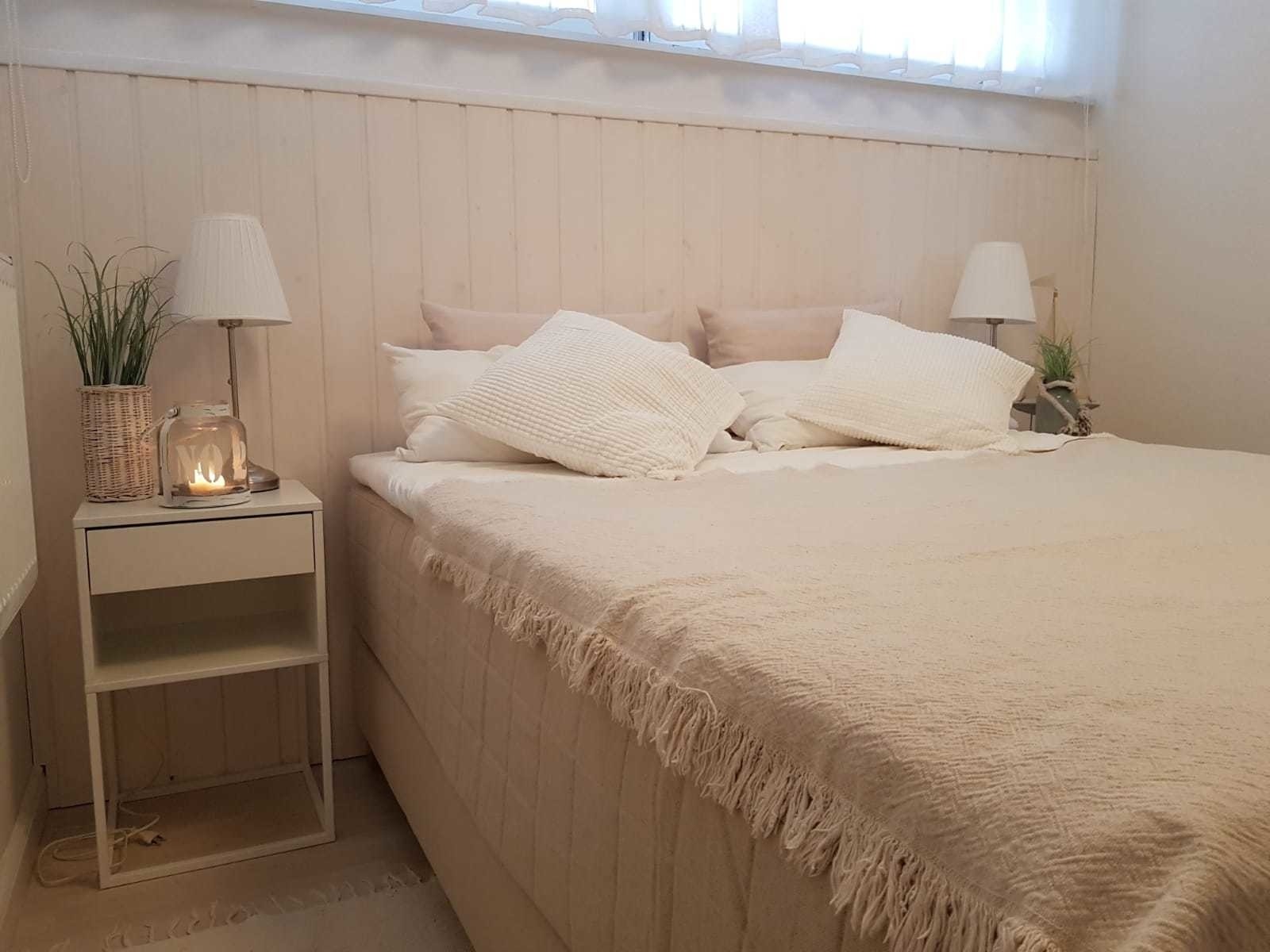 Das Schlafzimmer ist ausgestattet mit einem Boxspringbett (1,60 x 2,00), zwei Nachtschränkchen und einem großen Kleiderschrank, in dem ein Safe vorhanden ist.