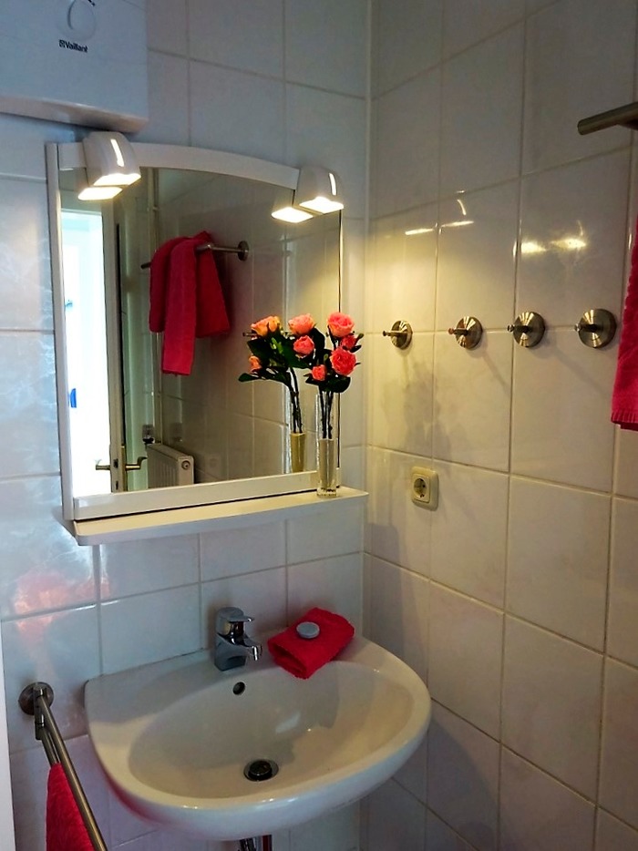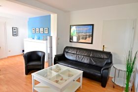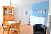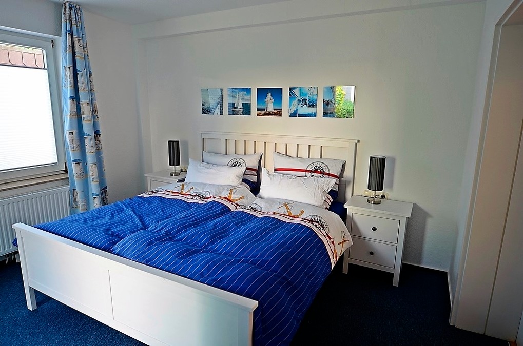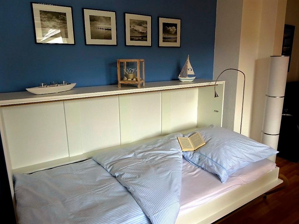 Die Wohnung Whg. 1 bietet ein großes Wohn-Esszimmer mit gemütlicher Sitzecke - schwarzes 3er Ledersofa, einen bequemen Fernsehsessel mit Liegefunktion- weißer Tisch mit maritimer Deko unter Glas, modererne TV-Wand mit Versorgungsschrank in weiß Hochglanzoptik, modernem Flachbild TV 102 cm, DVD-Player auf Wunsch, Esstisch für 4 Personen und antikes Weichholzküchenbüffett. Vorhänge mit Verdunkelungseffekt sowie ein Schrankbett - weiß Hochglanz - mit Liegefläche 90x200 für 1 Person, Laminatboden, WLAN. Das geräumige separate Schlafzimmer ist mit einem Doppelbett 180x200 versehen, Teppichboden maritim-blau. Plissees, Vorhänge mit Verdunkelungsmöglichkeit, Kleiderschrank in historischer Optik und shabby-stil (Sonnenschrank) und optional Kinderreisebett, Kommode mit Wickeltischoption, Babybett kann für das Schlafzimmer gestellt werden.