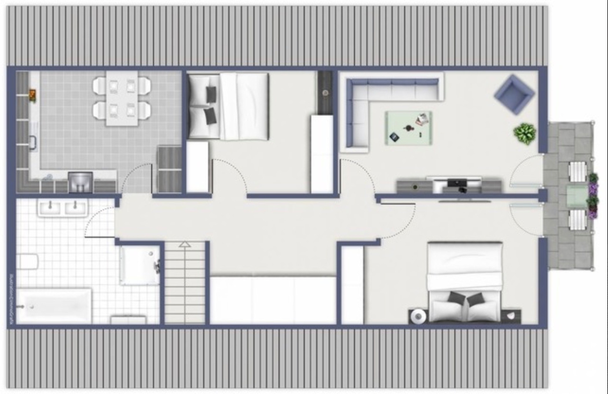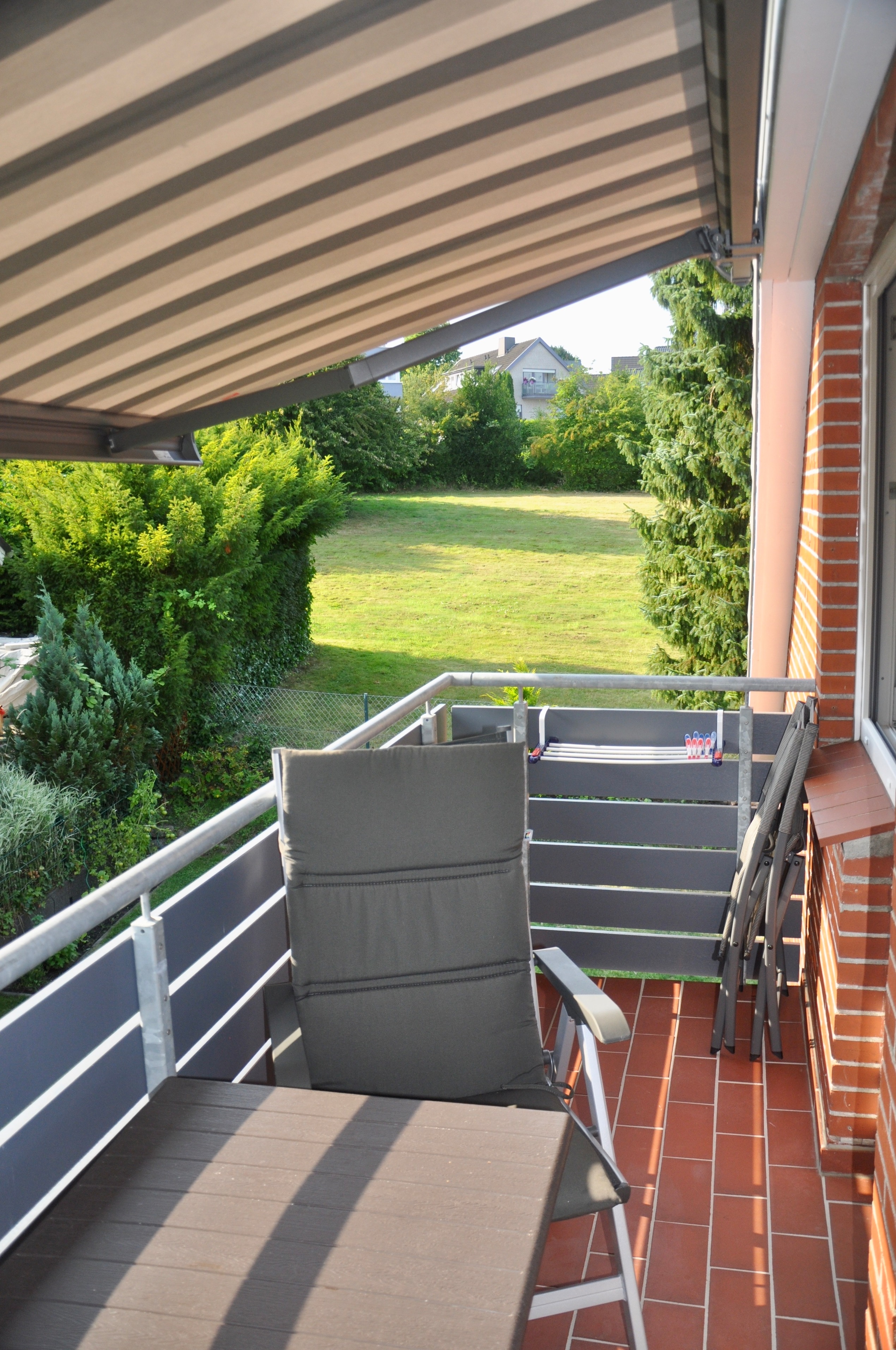 Vom Wohnzimmer, als auch von einem Schlafzimmer aus lässt sich der Balkon betreten. Gemütliche Balkonmöbel und ausfahrbare Markise sind selbstverständlich vorhanden.