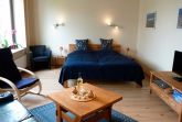 Es erwartet Sie ein großzügiges Wohn-Schlafzimmer mit einem schönen Blick in unseren Naturgarten. Ein kleines Schlafzimmer mit zwei Einzelbetten. Die Küche ist mit einem Elektroherd/Backofen, Geschirrspüler, Kühl/Gefrierschrank, Wasserkocher, Kaffeemaschine, Toaster ausgestattet.