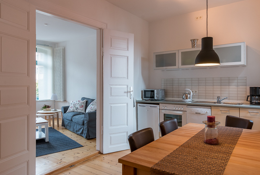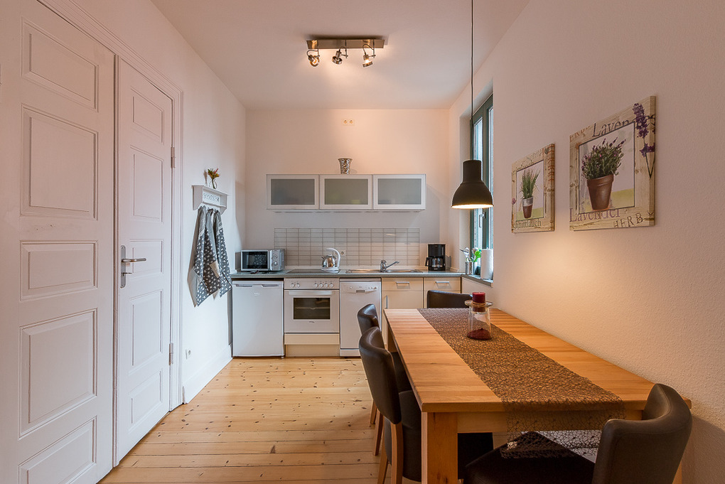 Die Küche bietet genügend Raum für ein gemütliches Zusammensein. Sie ist ausgestattet mit einem Geschirrspüler, einem Kühlschrank mit Gefrierfach, Mikrowelle, Toaster, Wasserkocher, Kaffeemaschine und vielen kleinen Küchenhelfern.