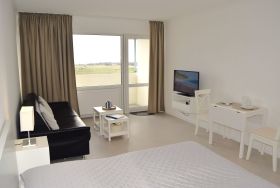 Das Ferienappartement verfügt über viel Komfort, wie einen kombinierten Wohn-/Schlafbereich mit Doppelbett und separater Couch, einer modernen Pantry-Küche sowie ein Duschbad.