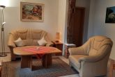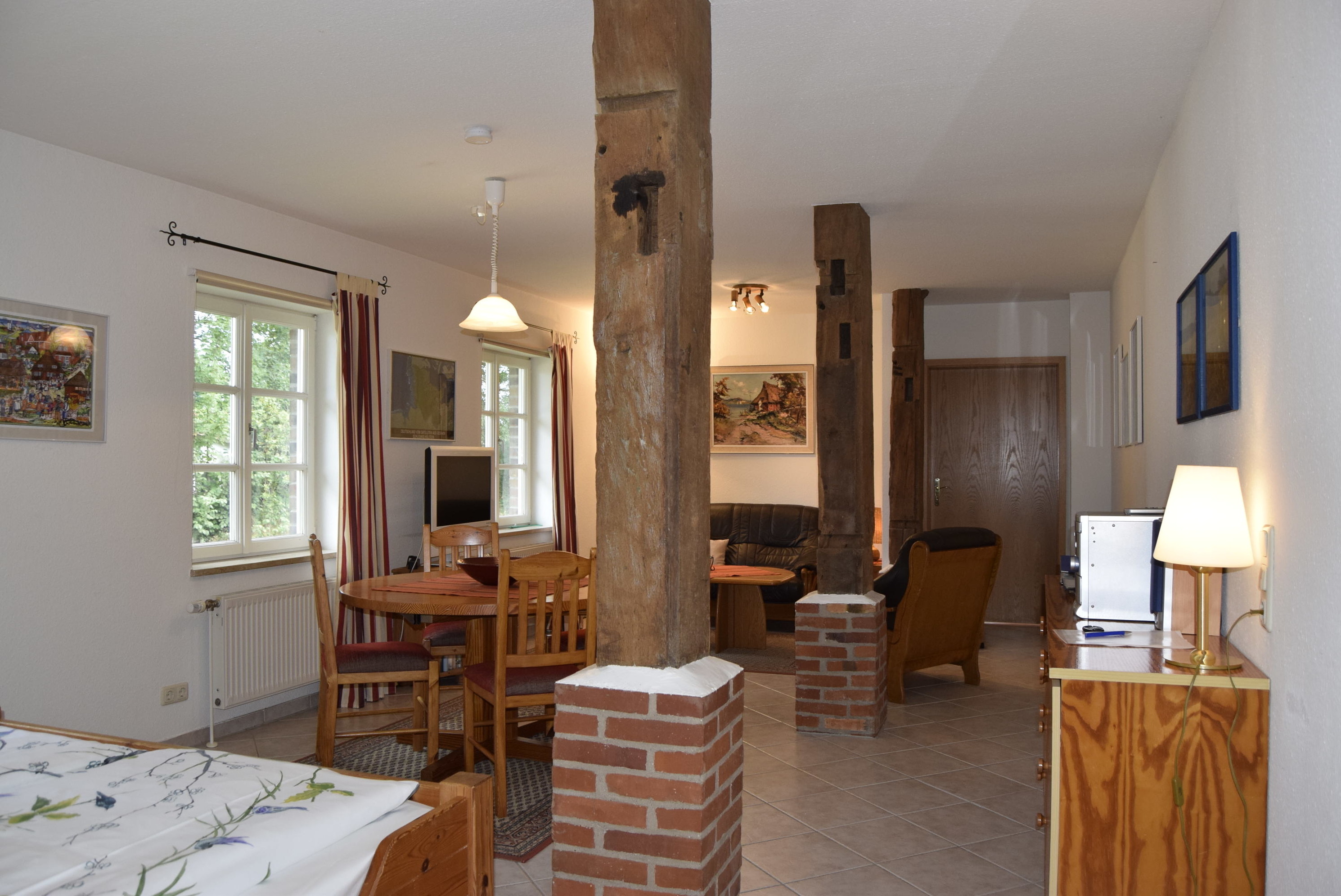 Der kombinierte Wohn- und Schlafbereich ist der Mittelpunkt der 52 qm großen Ferienwohnung und bietet ein Doppelbett (1,80m x 2,00m), eine gemütliche Sitzgarnitur, einen runden Esstisch mit vier Stühlen sowie einen großen Flachbildfernseher.
