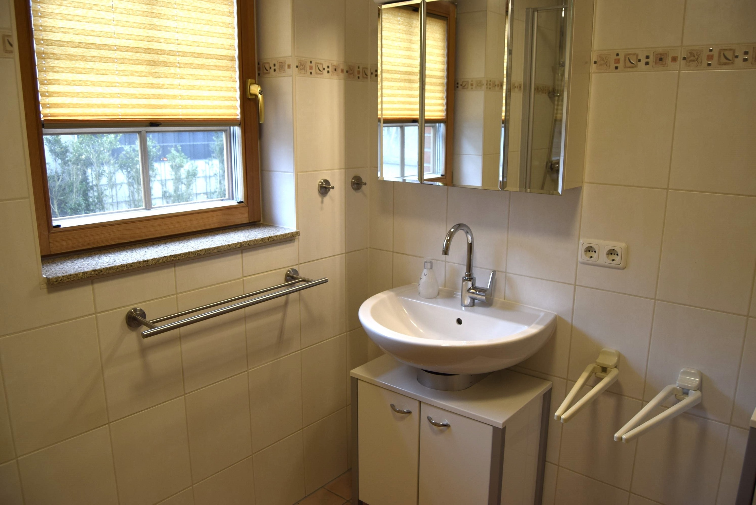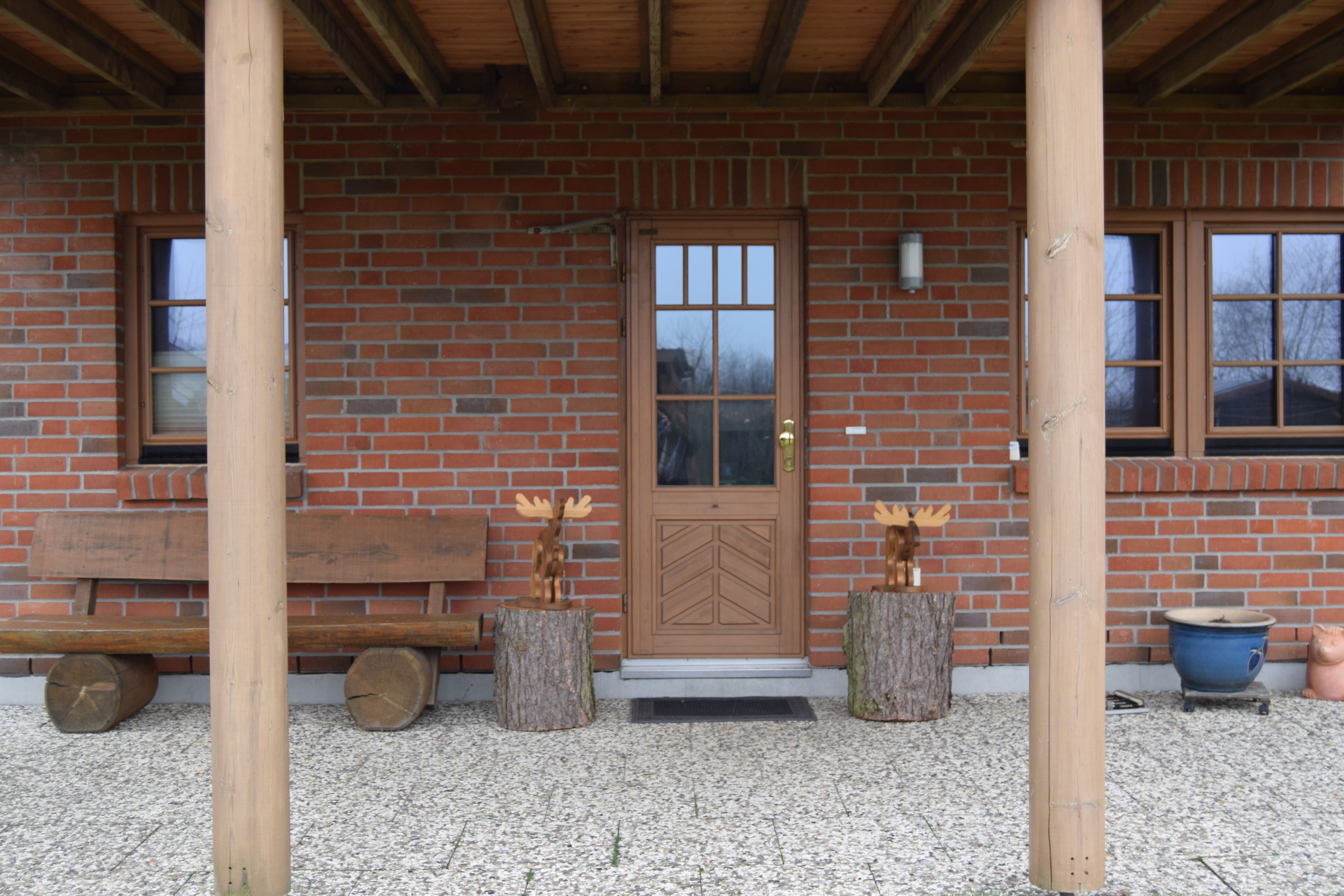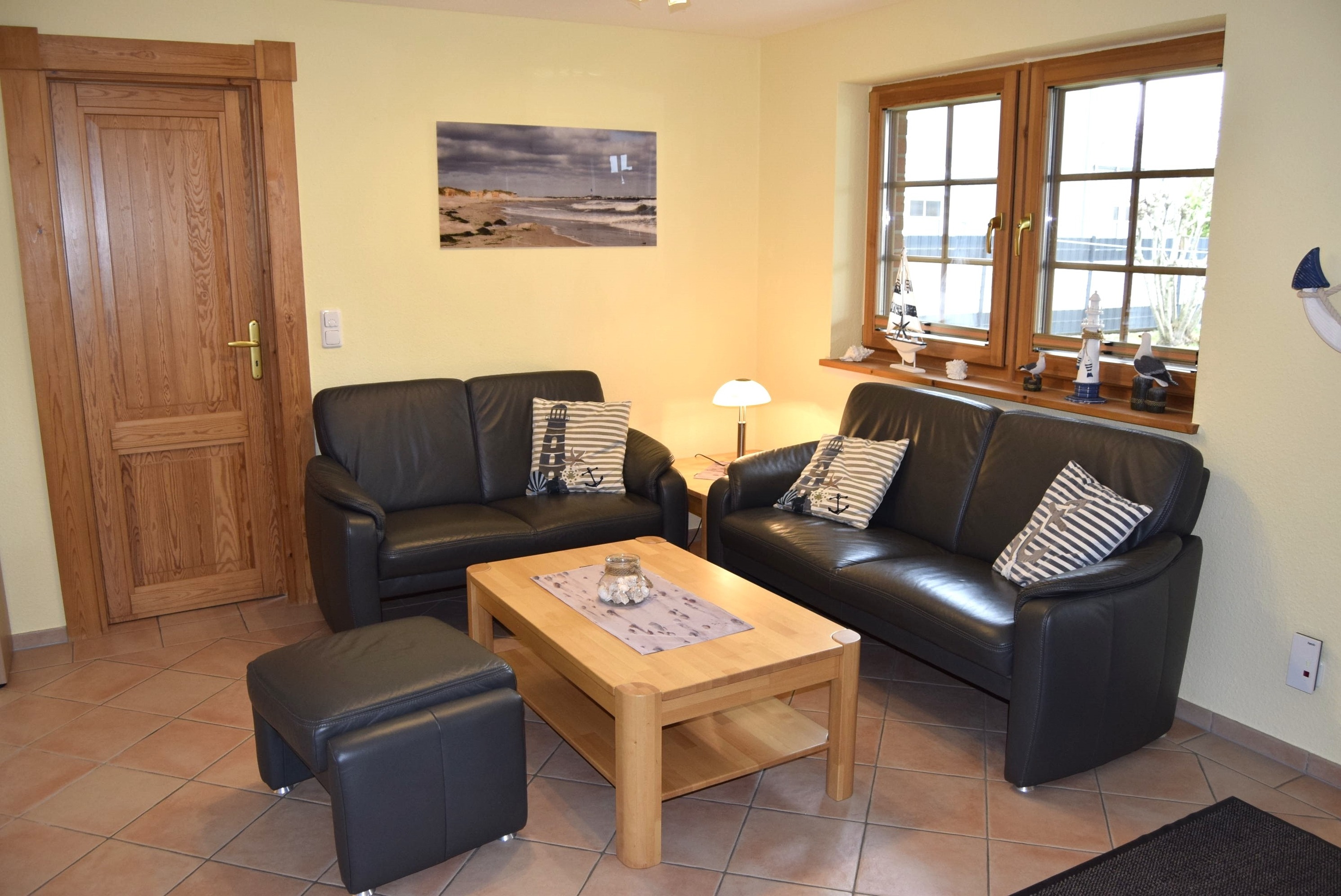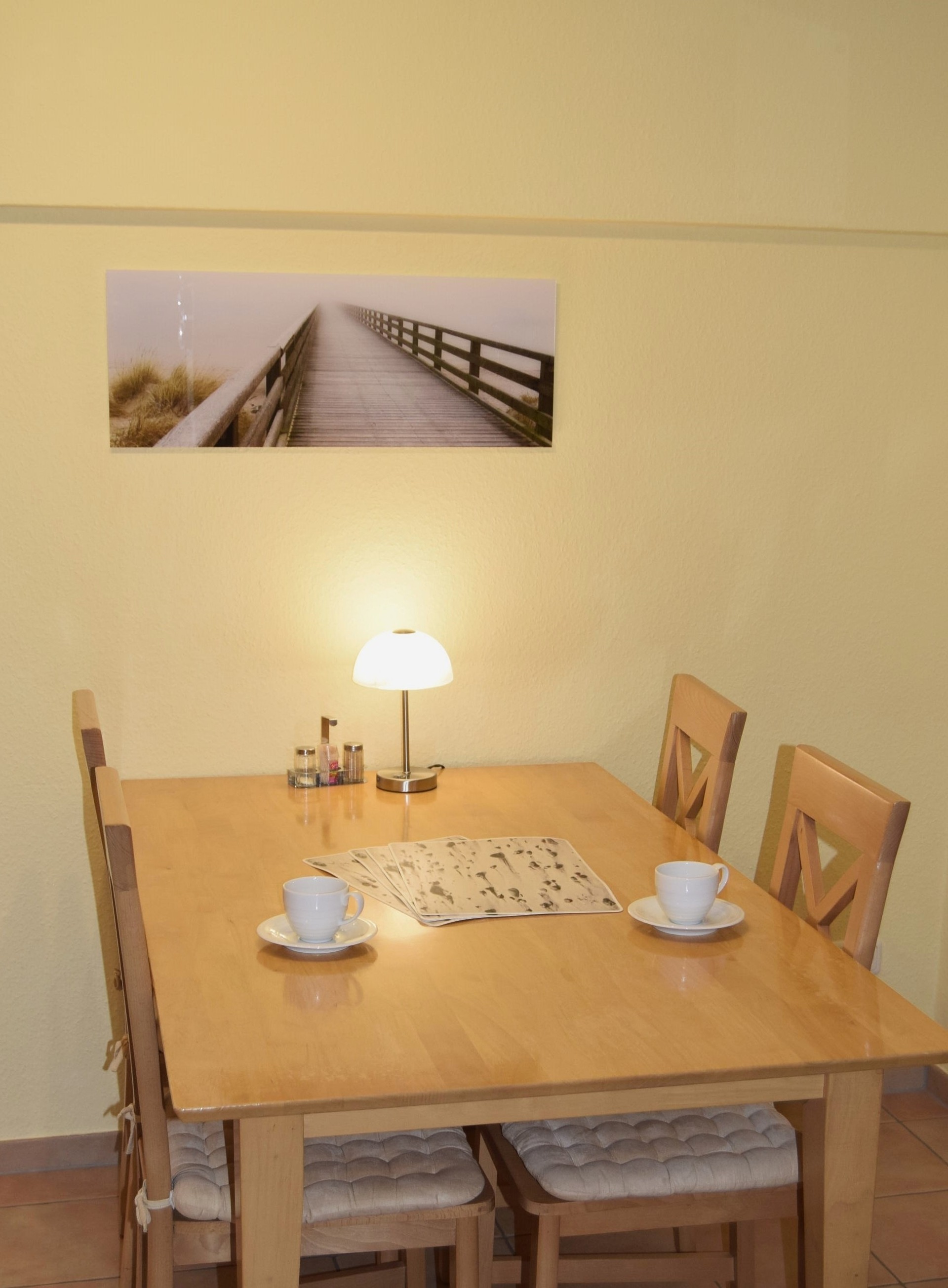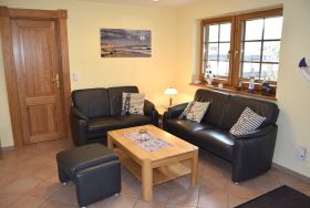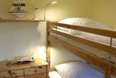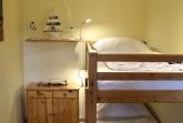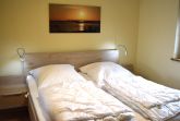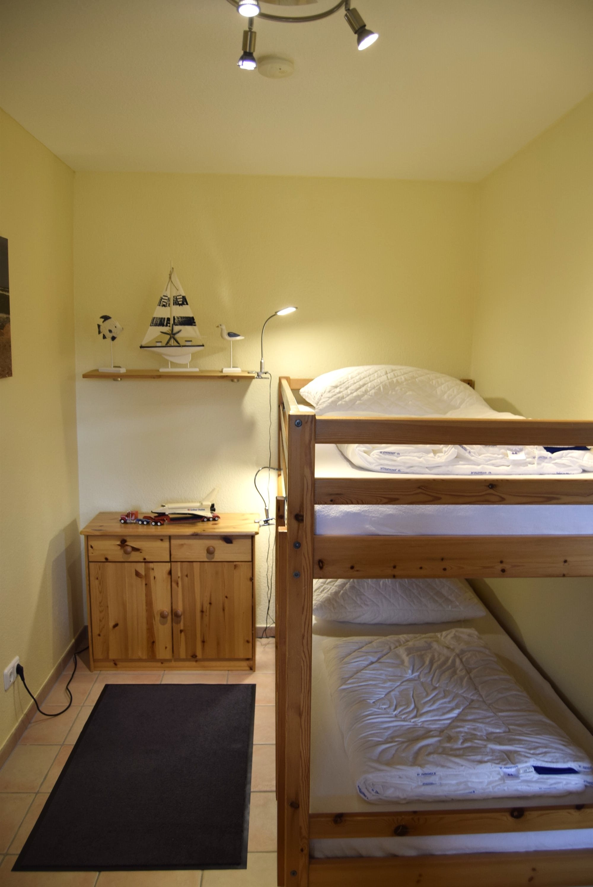 Sie liegt im Erdgeschoss des Zweifamilienhauses (Hanglage am Deich). Es gibt ein Schlafzimmer (11,8 qm) mit komfortablem Doppelbett (1,80 x 2,00 m) sowie ein Kinderzimmer (7,6 qm) mit Etagenbett (0,90 x 2,00 m).