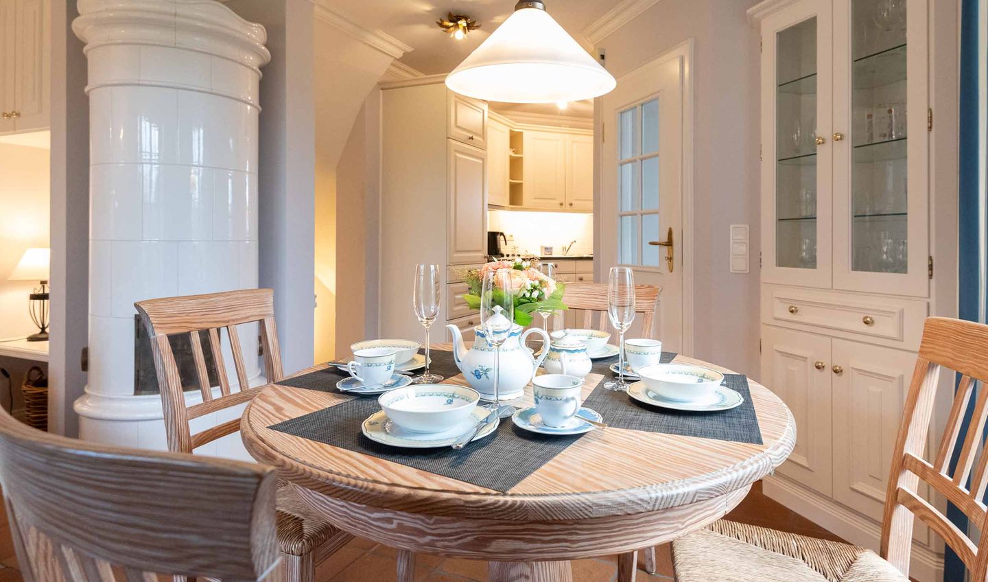 Wohn-/Koch-/Essbereich: Im großzügigen Wohnbereich befinden sich ein gemütliches Sofa, ein TV, ein edler Kachelofen sowie eine Einbauküche mit Essplatz. Von hier erreichen Sie auch die große Süd-Ost-Terrasse mit Gartenanteil, die während der Sommerzeit einen Strandkorb und Gartenmöbeln für Sie bereit hält.