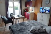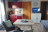 Offener Wohn / Schlaf - und Küchenbereich (2Platten-Ceranfeld, Kühlschrank m. Gefrierfach. Kaffeemaschine, Toaster, Wasserkocher. Box- Bett 140cm x 200cm, 2 Sessel am Esstisch, Digital- Sat- TV, Radio, Spiele, Bücher.