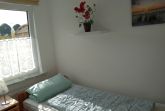 Kleines Zimmer. m. 1 Bett (90cmx200cm), Nachtschrank, Kommode. Es kann ein Rausfallschutz zur Verfügung gestellt werden. Dusche/ WC m. Fön. Bodenbelag: Fliesen u. PVC. Waschmaschine u. Trockner im Haus. Süd- West- Terrasse mit Gartentisch u. Stühle mit Auflagen.