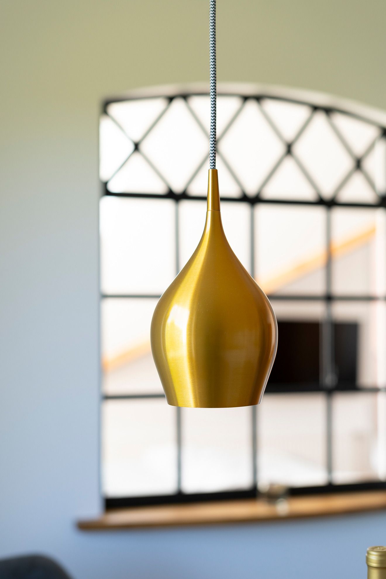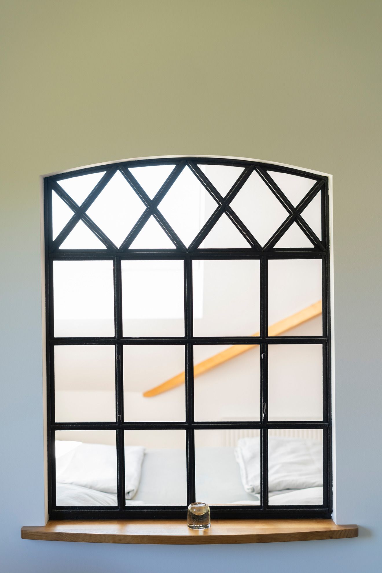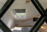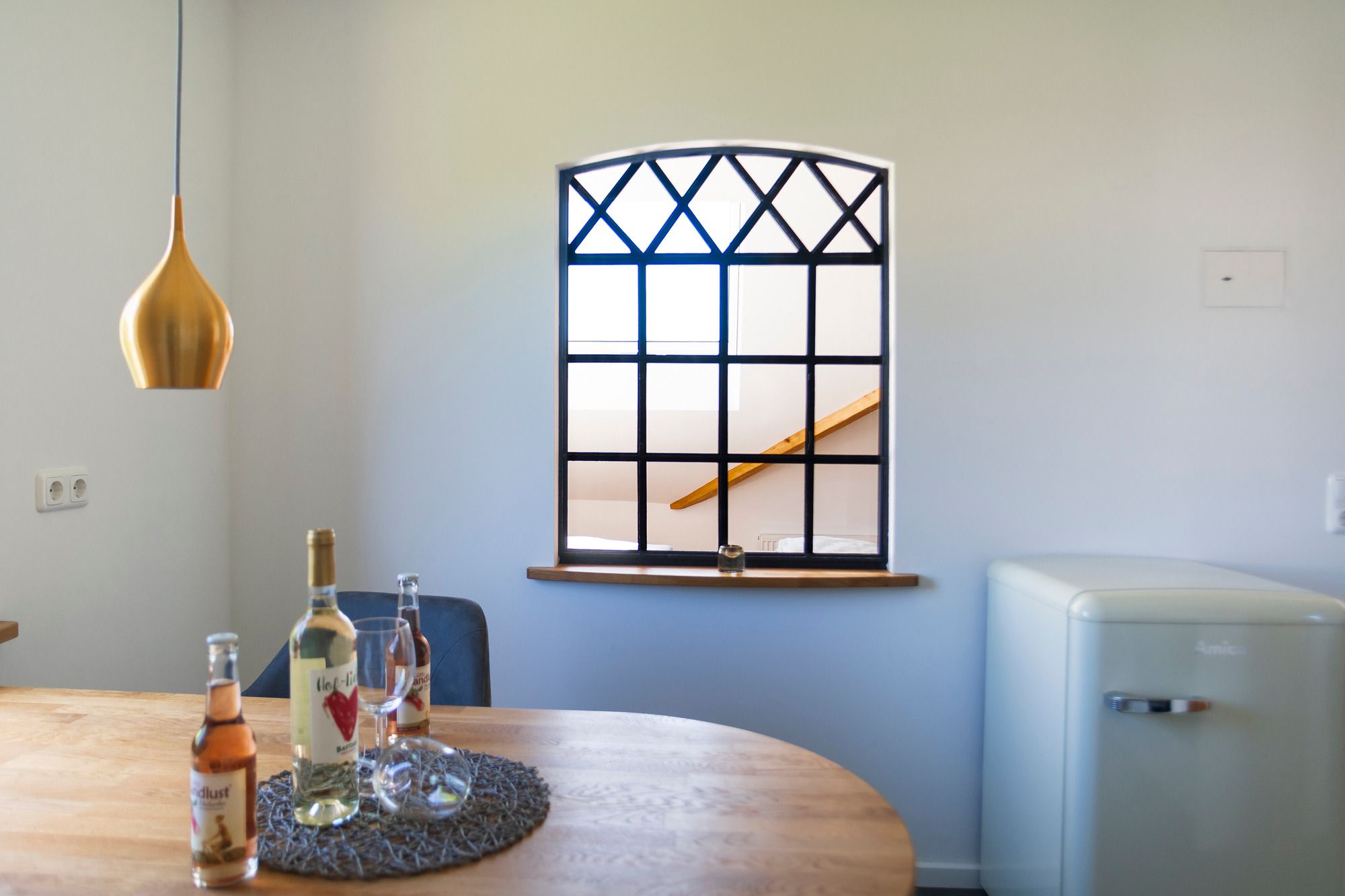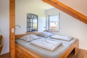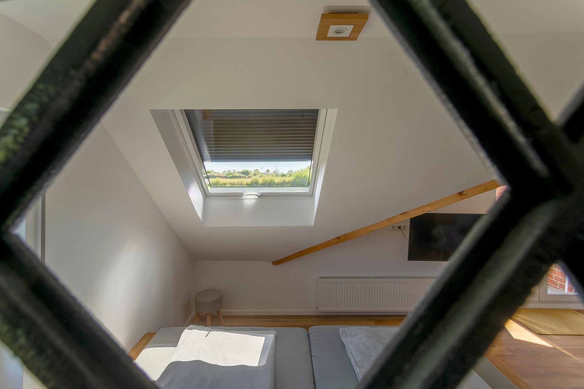 Aus der ehemaligen 3-Zimmer-Wohnung wurden alle Leichtbauwände entfernt. Eine tragende Steinwand innerhalb der Wohnung ist stehen geblieben und wurde mit einem historischen Industriefenster aufgelockert. Das Fenster kommt aus einer Hamburger Fabrik und wurde im Rahmen der Sanierung sandgestrahlt und sorgfältig lackiert. Zusammen mit dem neuen Panorama-Dachfenster über dem großzügigen Bett bringt das viel Licht in die Wohnung. Das Dachfenster hat eine elektrische Außenjalousie für alle, die es zum Schlafen dunkel brauchen. Alle anderen Außenfenster im Wohnbereich haben manuelle Außenjalousien. Das Bett mit zwei Matratzen in 120 x 200 cm bietet sehr viel Platz zu zweit und eignet sich auch gut als Familienbett. Das große Dachfenster über dem Bett eröffnet einen tollen Blick auf den häufig beeindruckend klaren Sternenhimmel hier bei uns an der dünn besiedelten Ostsee mit wenig Light-Pollution.