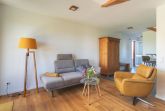 Der Sitzplatz in der Küche mit dem halbrunden Tisch aus massiver, pflanzlich geölter Eiche und den beiden gemütlichen Lounge-Sesseln bietet in den laubfreien Jahreszeiten einen schönen Blick über das Land bis zur Ostsee. Im Sommer blühen Kletterrosen direkt vor dem Fenster. Der zweite Sitzplatz im Wohnbereich hat einen „Überraschungssessel“ aus kurkumafarbenem Leder und eine Chaiselongue mit edlem Stoffbezug, elektrisch zu verstellender Sitzbreite und Ausrichtung zur großen Balkontür mit Blick bis zum Leuchtturm Dahmeshöved. Auch an Freunde von Tresenstühlen wurde in der Küche gedacht.