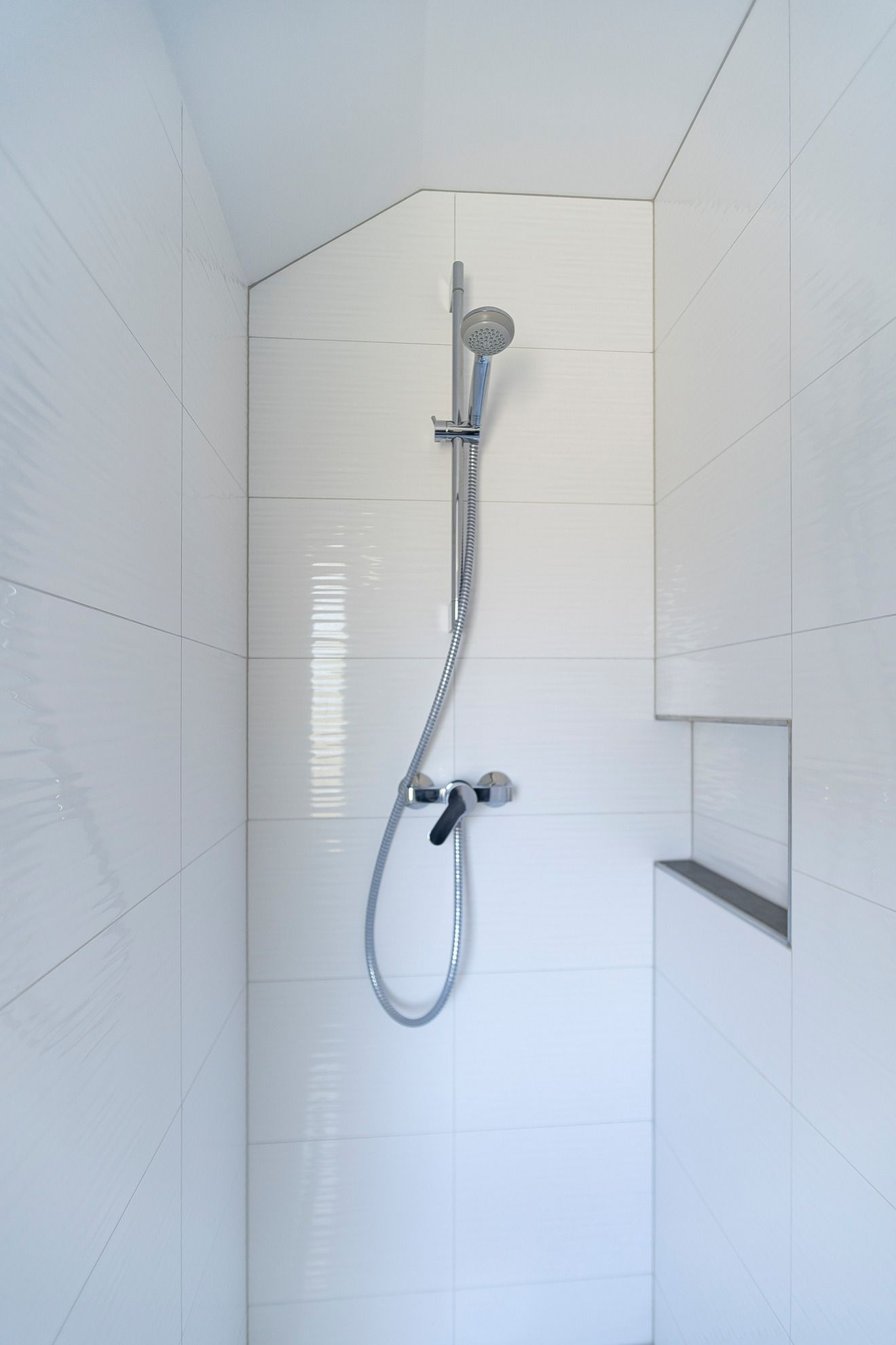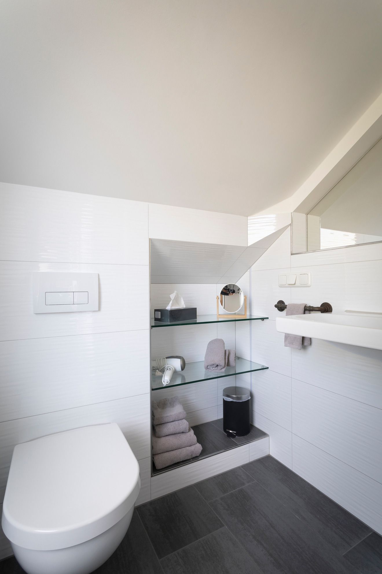 Im kleinen Badezimmer konnte durch die Nutzung der Abseite für ein Regal mit zwei massiven Glasböden, dem angepassten dreieckigen Spiegel am Waschbecken und der emaillierten, ultraflachen Duschtasse (90 x 120 cm) der zur Verfügung stehende Platz optimal ausgenutzt werden. Die Glasregale werden durch in die Fliesen eingelassene LED-Stripes betont. Harmonisch hell wird das Bad durch drei Einbaustrahler in der Decke und einen separat zu schaltenden Spot am Spiegel. Das Bad hat ein dreieckiges Fenster mit lichtdurchlässigem Ornamantglas.