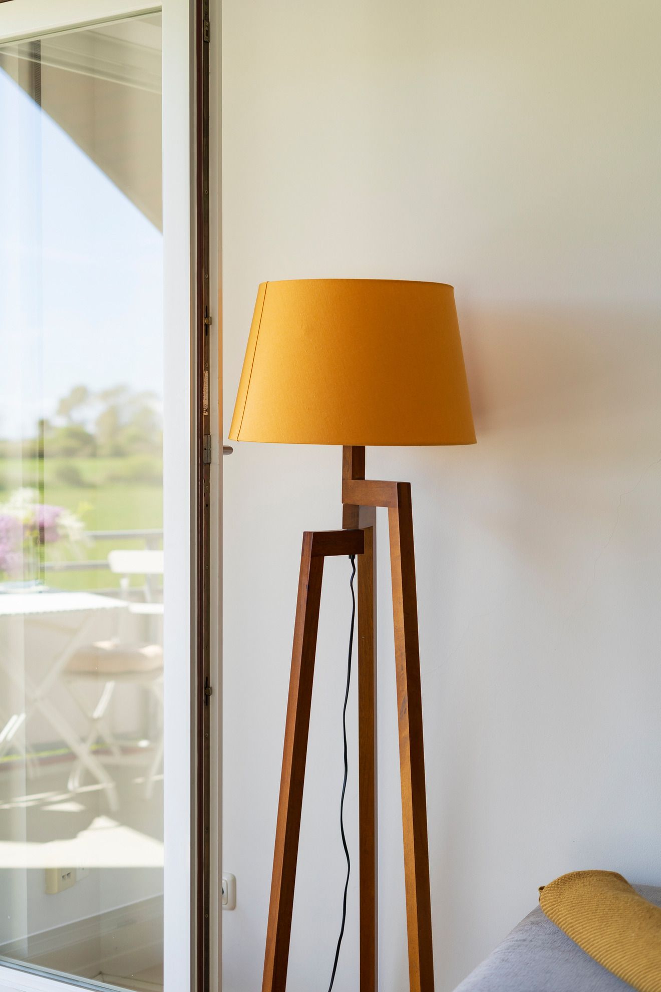 Zwei diagonale Kehlbalken gehen durch die Wohnung. Schon das macht den Grundriss der Wohnung sehr abwechslungsreich. Die Balken aus grobem Bauholz wurden bei der Sanierung freigelegt, abgeschliffen und anfeuernd geölt (Naturtrend Zweihorn Hartöl). Dieses Feature bringt etwas Natur in die ansonsten klar strukturierte Wohnung. Der historische Eindruck der Dachbalken findet sich im antiken Jugendstil-Kiefernschrank wieder. Als weiteres Holz wurde Eiche verwendet. Aus geöltem Eichenholz sind die sanft runden Fensterbänke, das rustikal anmutende Parkett im Wohnbereich, das große Bett und der Esstisch.